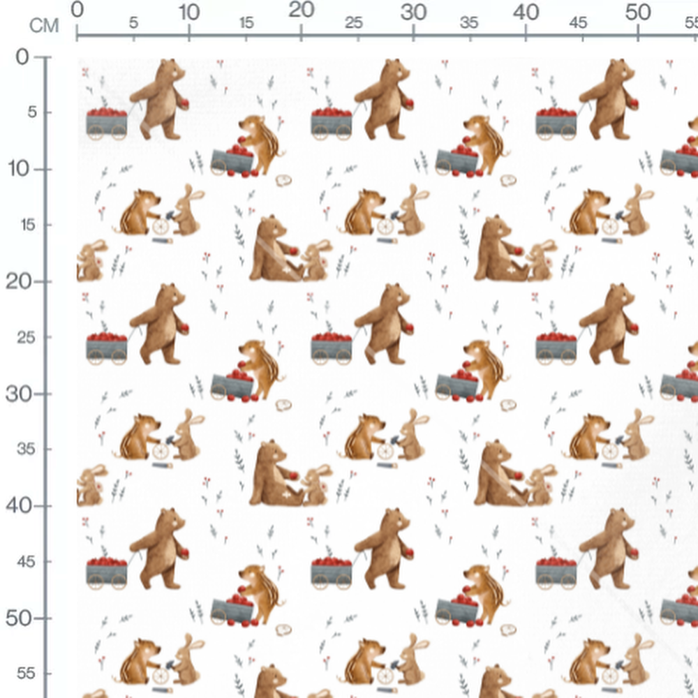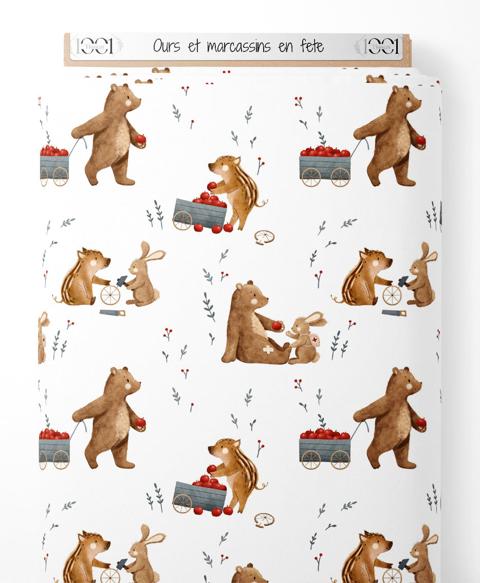 Un ours brun tire un chariot rempli de pommes rouges. Un marcassin brun joue avec un lapin beige. Des éléments de branches et baies rouges ajoutent des détails au motif.Les tissus