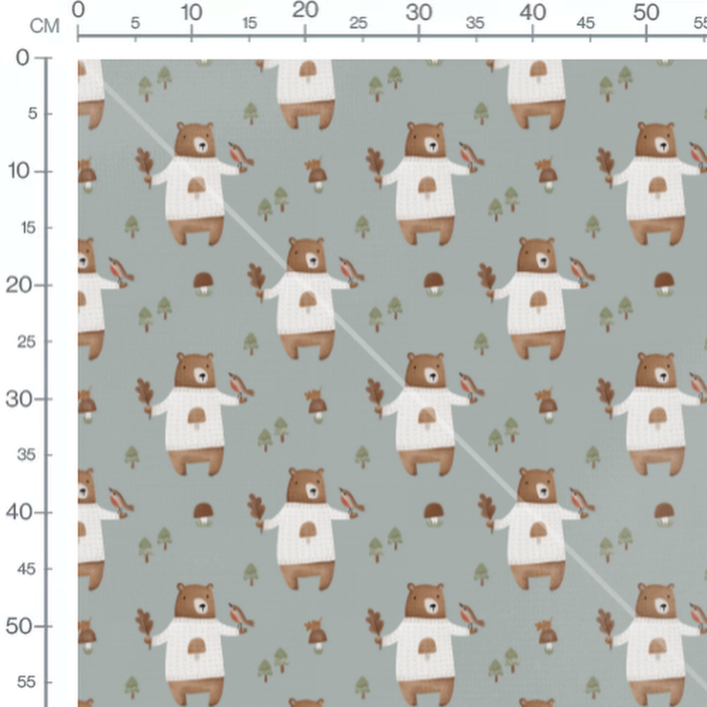 Les ours portent des pulls blancs décorés d'un motif de champignon. Les oiseaux rouges sont perchés sur les bras des ours. De petits arbres verts et des champignons marron complètent le motif.Les tissus