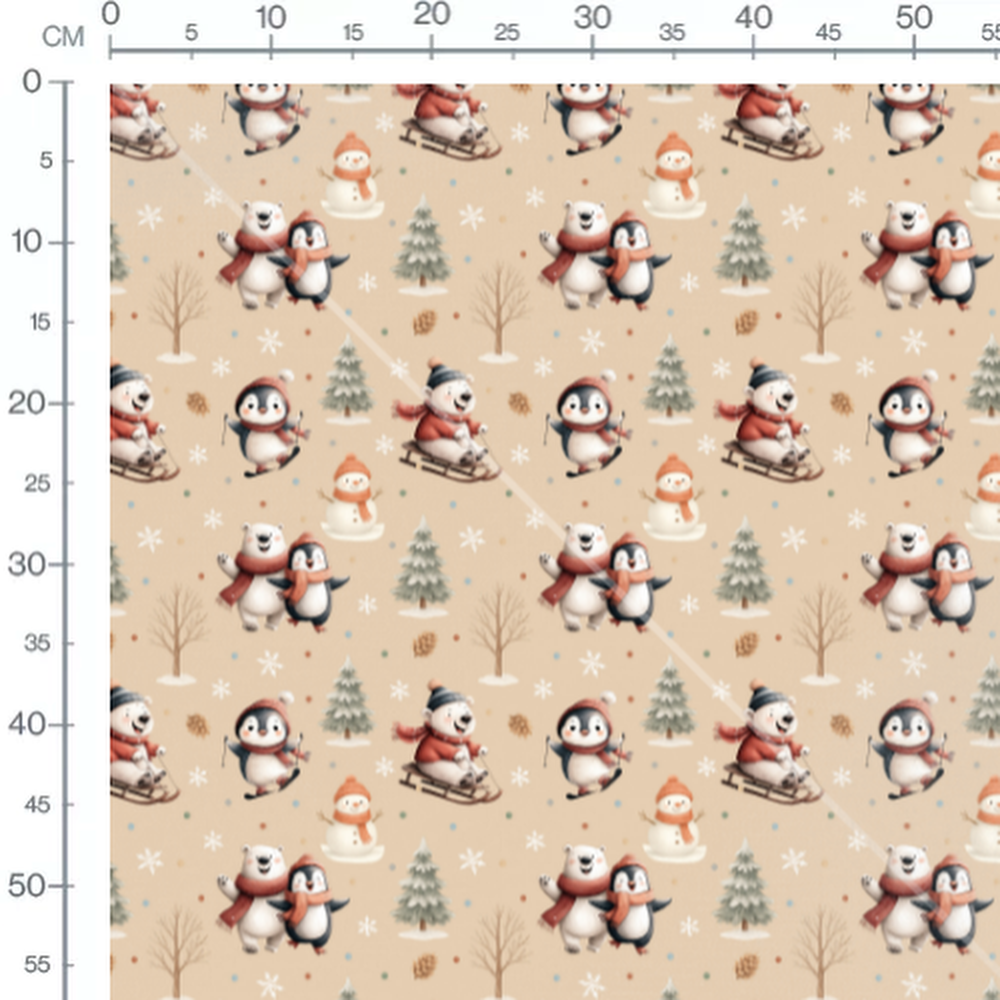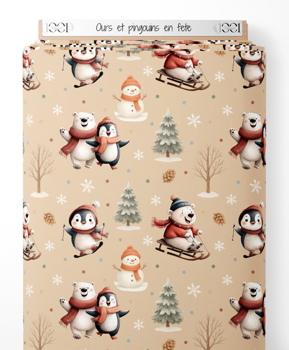 Les ours et pingouins portent des écharpes rouges. Le bonhomme de neige est accompagné de sapins et de flocons blancs. Des points colorés ajoutent une touche festive au fond beige.Les tissus