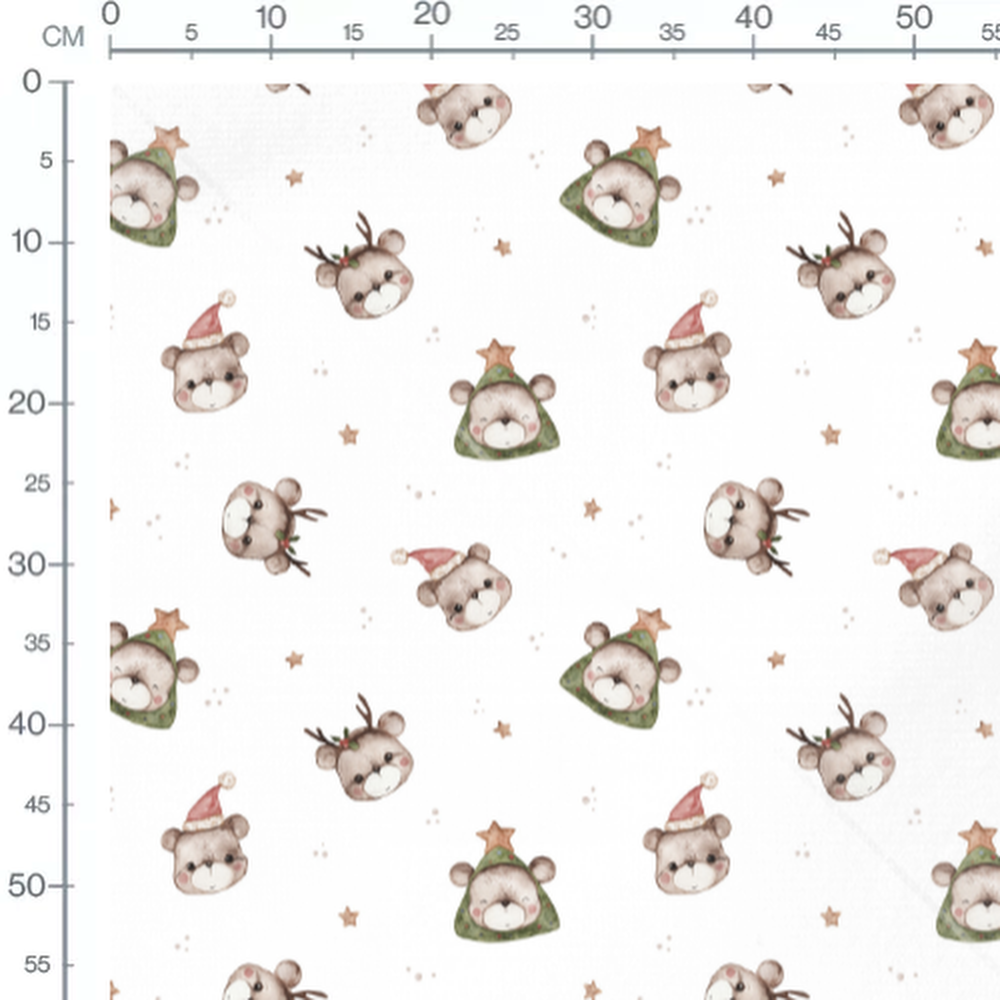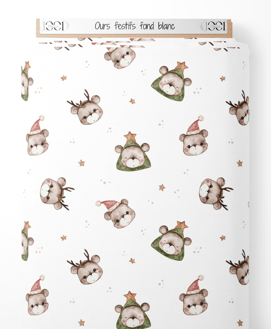 Les ours portent des chapeaux de Noël rouges et verts. Certains ours ont des bois de renne marron. Les étoiles marron ajoutent une touche festive au motif.Les tissus