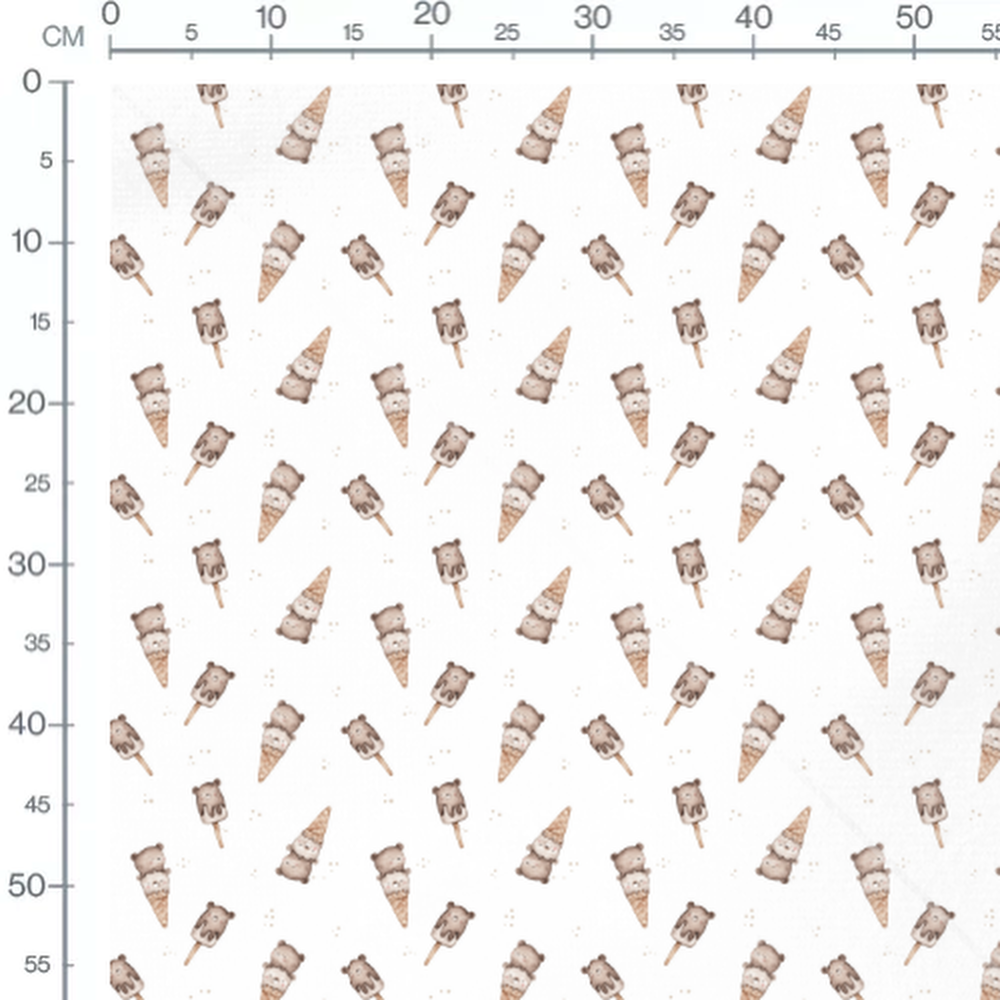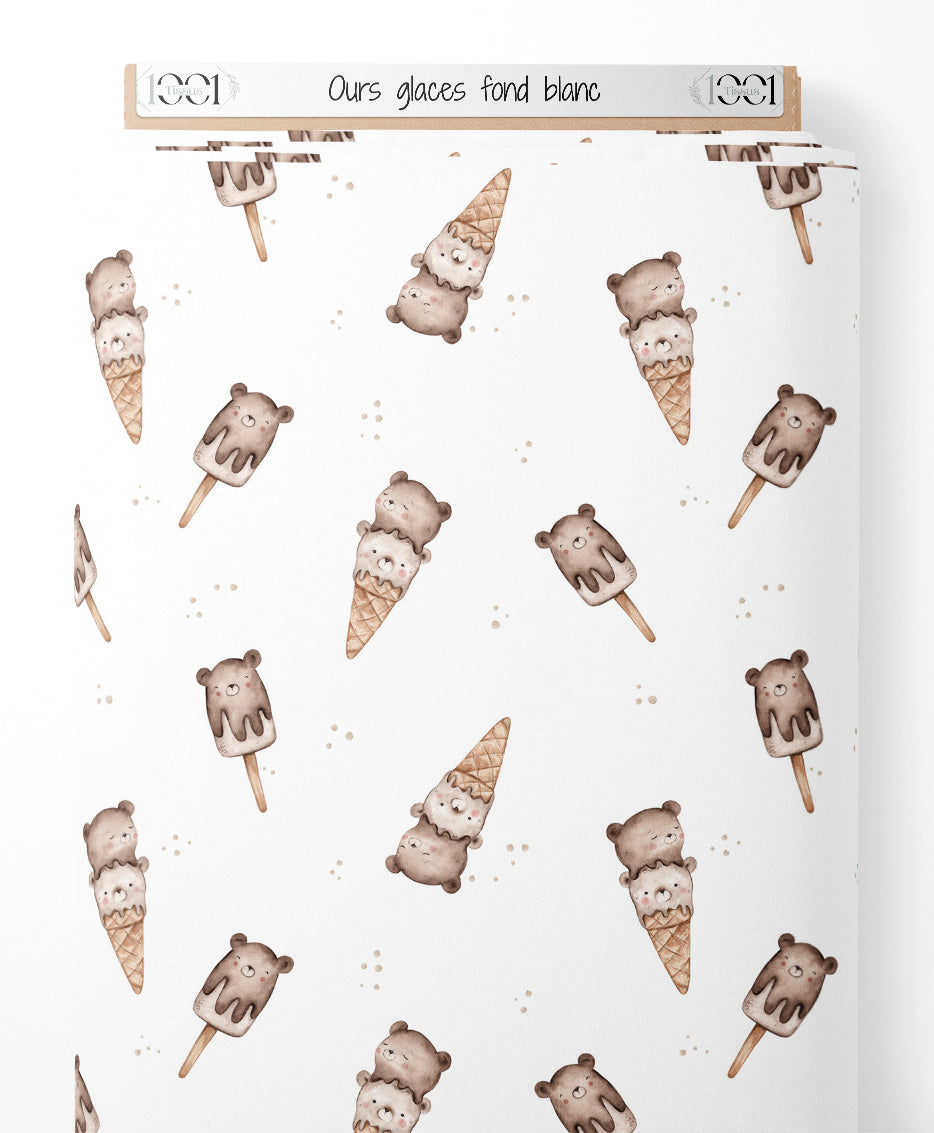 Les ours sont représentés sous forme de crème glacée dans des cornets et d'esquimaux. Les couleurs sont principalement brunes et beiges avec un fond blanc pur.Les tissus
