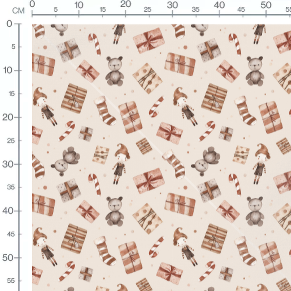 Les cadeaux sont ornés de motifs à rayures et pois. Les ours en peluche sont de couleur grise. Les lutins portent des chapeaux pointus assortis aux chaussettes rayées.Les tissus