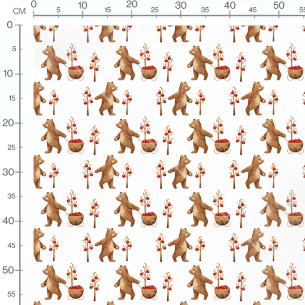 Les ours bruns sont représentés avec un air joyeux. Les arbres sont petits avec des pommes rouges vives. Le chariot en bois est simple et rustique.Les tissus
