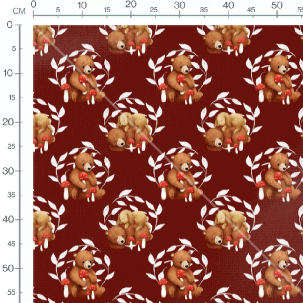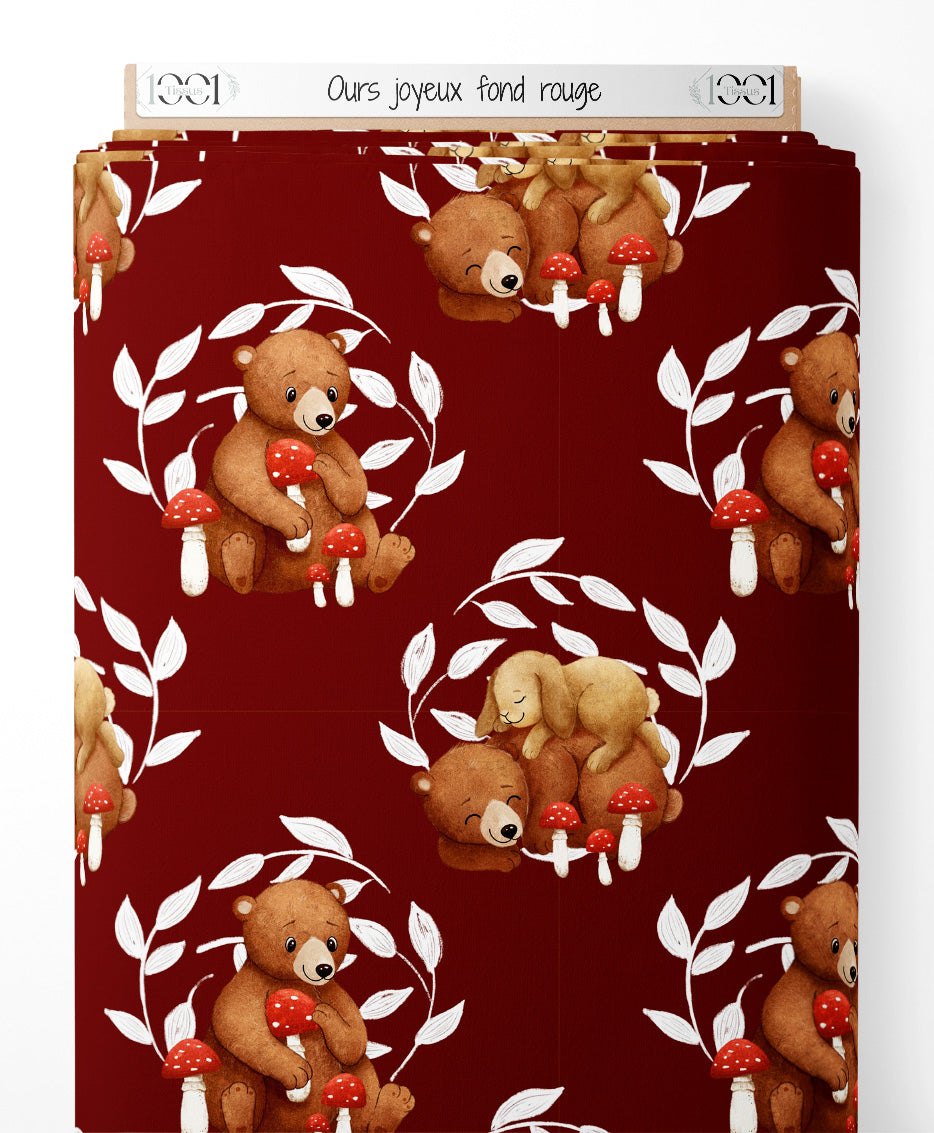 Les ours bruns sont dessinés avec des expressions joyeuses. Les champignons rouges ont des taches blanches. Les feuilles blanches ajoutent un contraste délicat au fond rouge.Les tissus