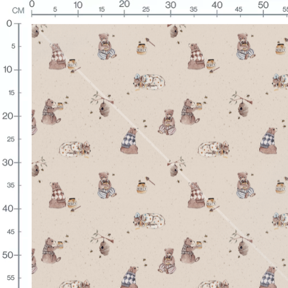 Les ours portent des vêtements à motifs géométriques et rayés. Les pots de miel sont étiquetés et les abeilles volent autour. Une ruche est suspendue à une branche au centre du motif.Les tissus
