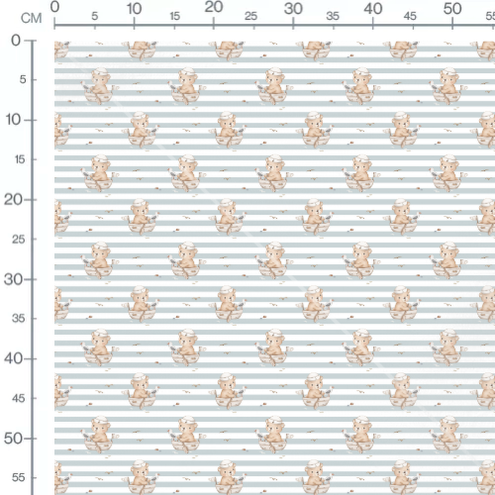 Les ours portent des chapeaux de marin et sont accompagnés de mouettes. Le fond est composé de rayures horizontales bleues et blanches. De petits bateaux en bois et des oiseaux en vol ajoutent des détails marins.Les tissus