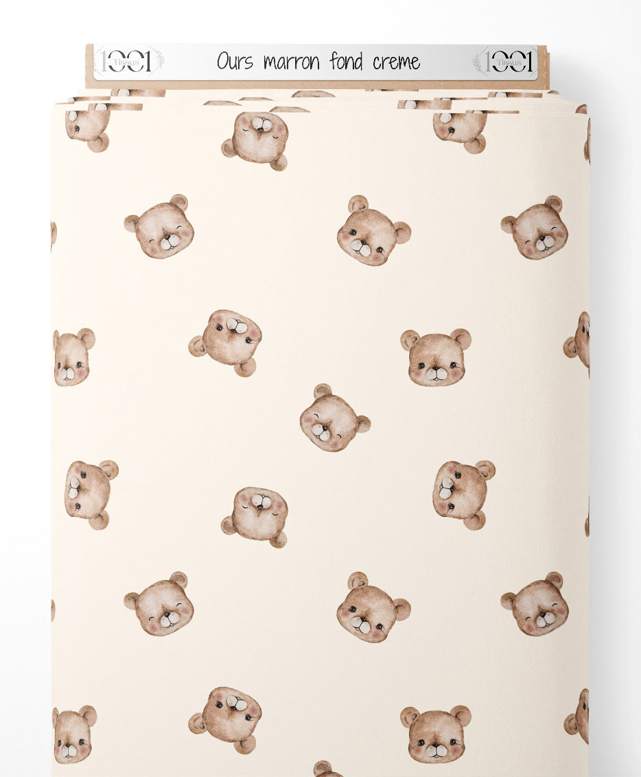 Les ours ont des expressions faciales différentes, ajoutant une touche ludique. Les joues roses contrastent avec le fond crème. Chaque tête d'ours est dessinée dans un style aquarelle doux.Les tissus