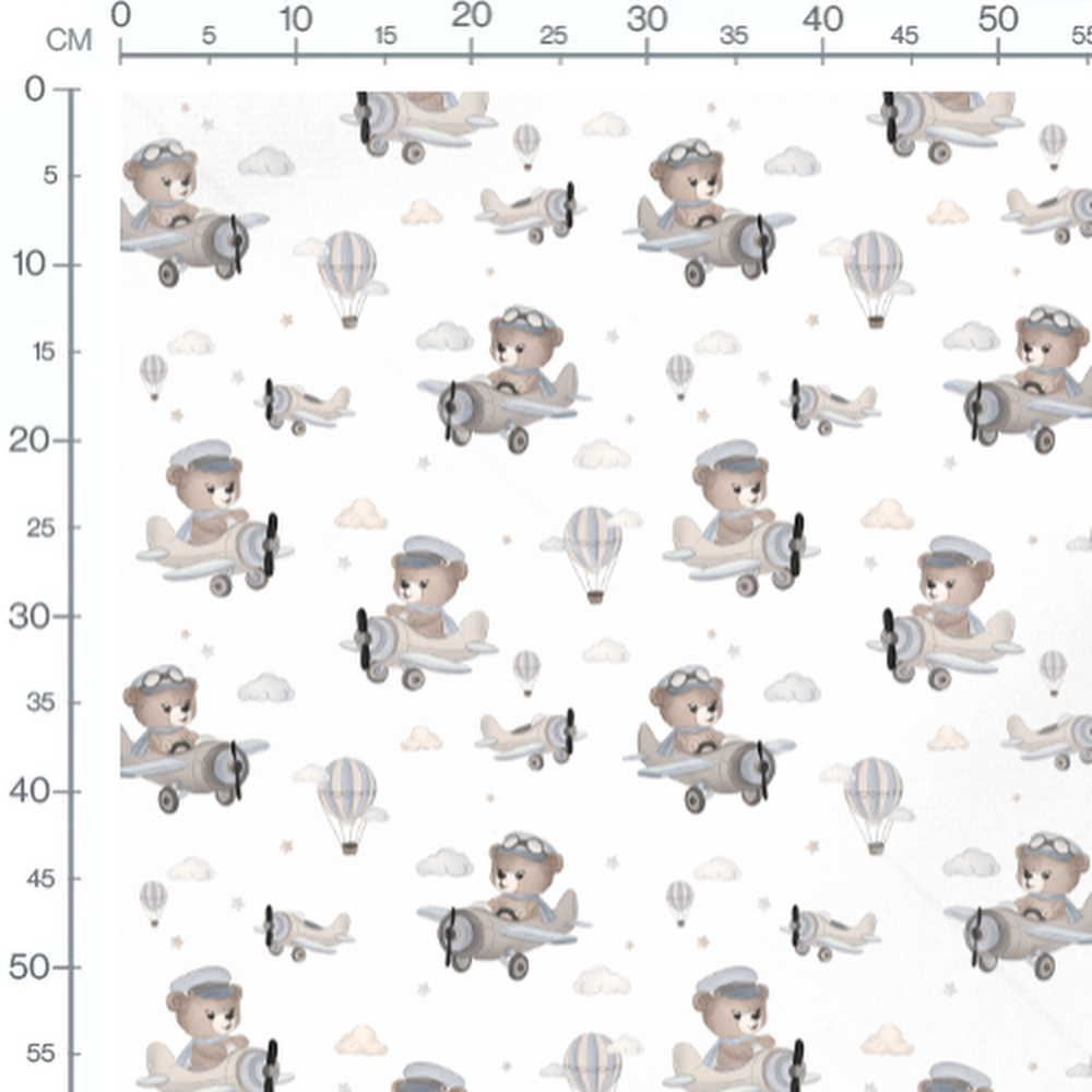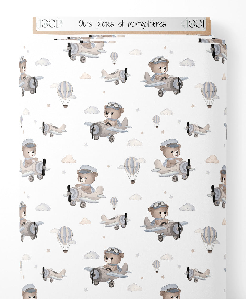 Les ours portent des lunettes d'aviateur et des casquettes. Les montgolfières sont rayées de gris et blanc. De petits nuages et étoiles complètent le motif.Les tissus