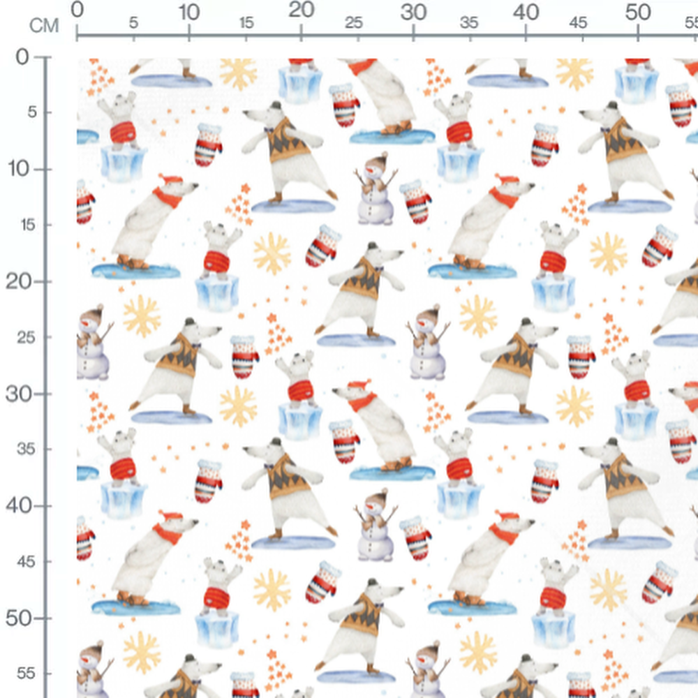 Les ours polaires portent des écharpes rouges et des pulls à motifs. Des moufles rouges et blanches sont éparpillées. Des bonhommes de neige avec chapeaux bruns complètent le motif.Les tissus
