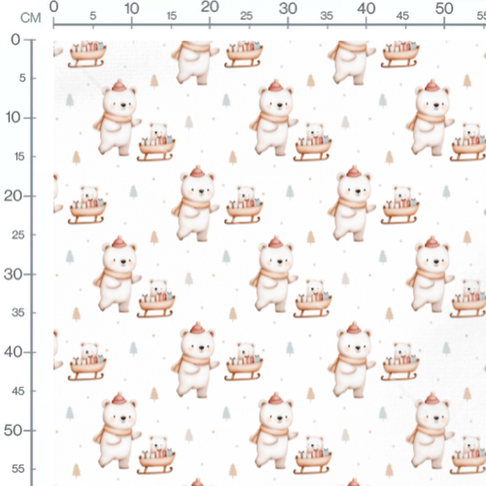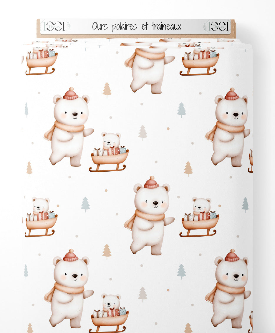 Les ours portent des bonnets rouges et des écharpes beige. Les traîneaux sont remplis de cadeaux colorés. De petits sapins beige et gris sont dispersés sur le fond blanc.Les tissus