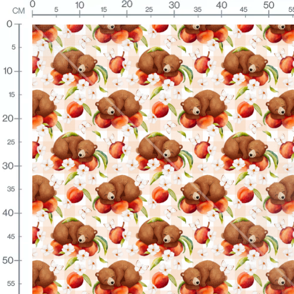 Les ours bruns sont paisiblement endormis sur des pêches juteuses. Des fleurs blanches délicates entourent les ours, ajoutant une touche de douceur. Des papillons blancs volent autour, créant une ambiance légère. Les feuilles vertes apportent une touche de fraîcheur au motif.Les tissus