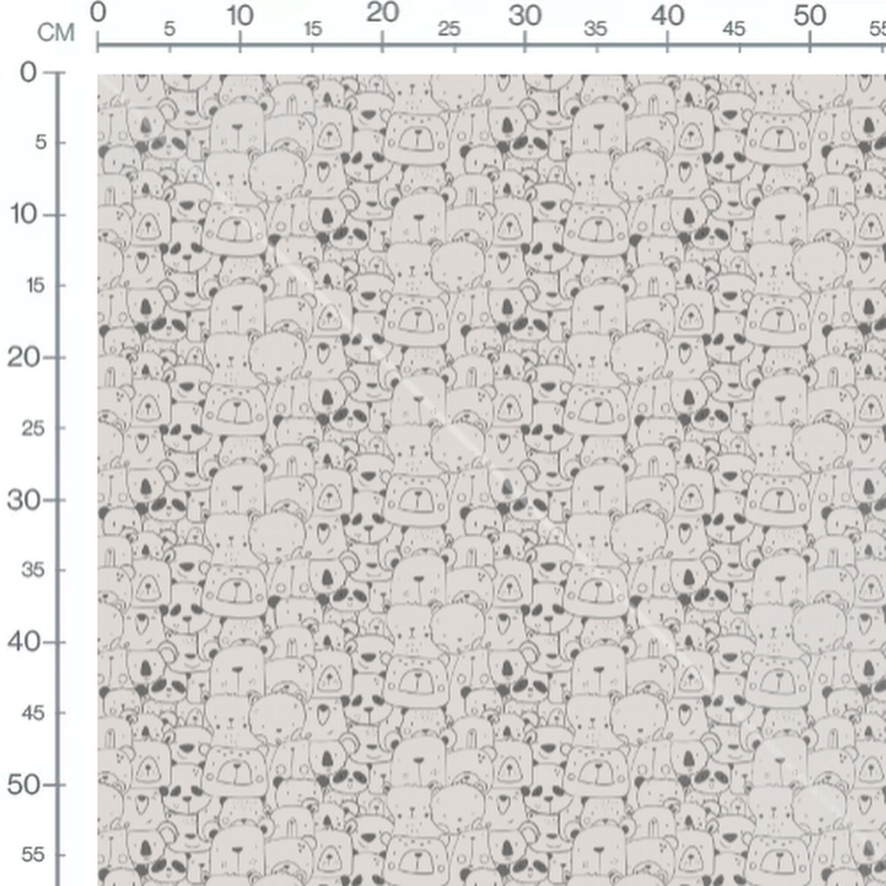 Les ours ont des expressions variées, allant de joyeuses à endormies. Les dessins sont en noir et blanc, créant un contraste subtil. Le motif est répétitif et ludique, idéal pour un thème enfantin.Les tissus
