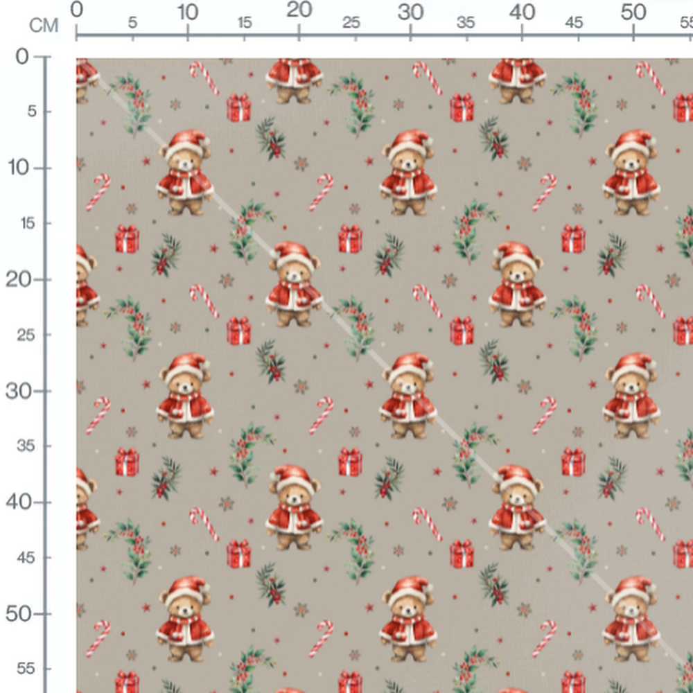 Les oursons portent des chapeaux et écharpes rouges. Des bonbons en forme de canne, des cadeaux rouges et des feuillages décorent le motif. Des étoiles rouges et des points verts ajoutent des détails festifs.Les tissus