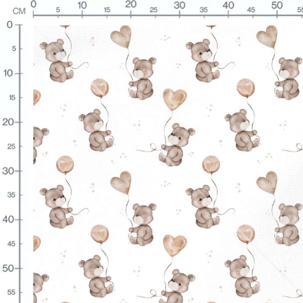 Les oursons sont assis et tiennent des ballons attachés par une ficelle. Les ballons sont de différentes formes, incluant des cœurs et des cercles.Les tissus