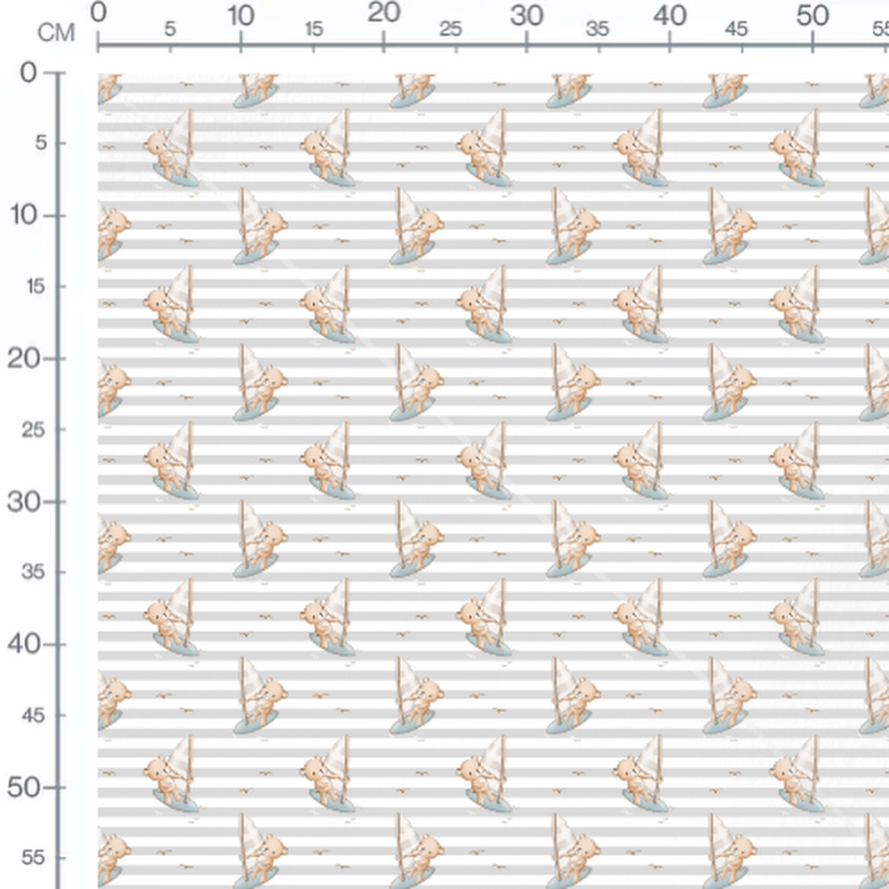 Les oursons tiennent des voiles rayées blanches et grises. Petites vagues blanches autour des planches à voile. Les mouettes ajoutent une touche marine au motif.Les tissus
