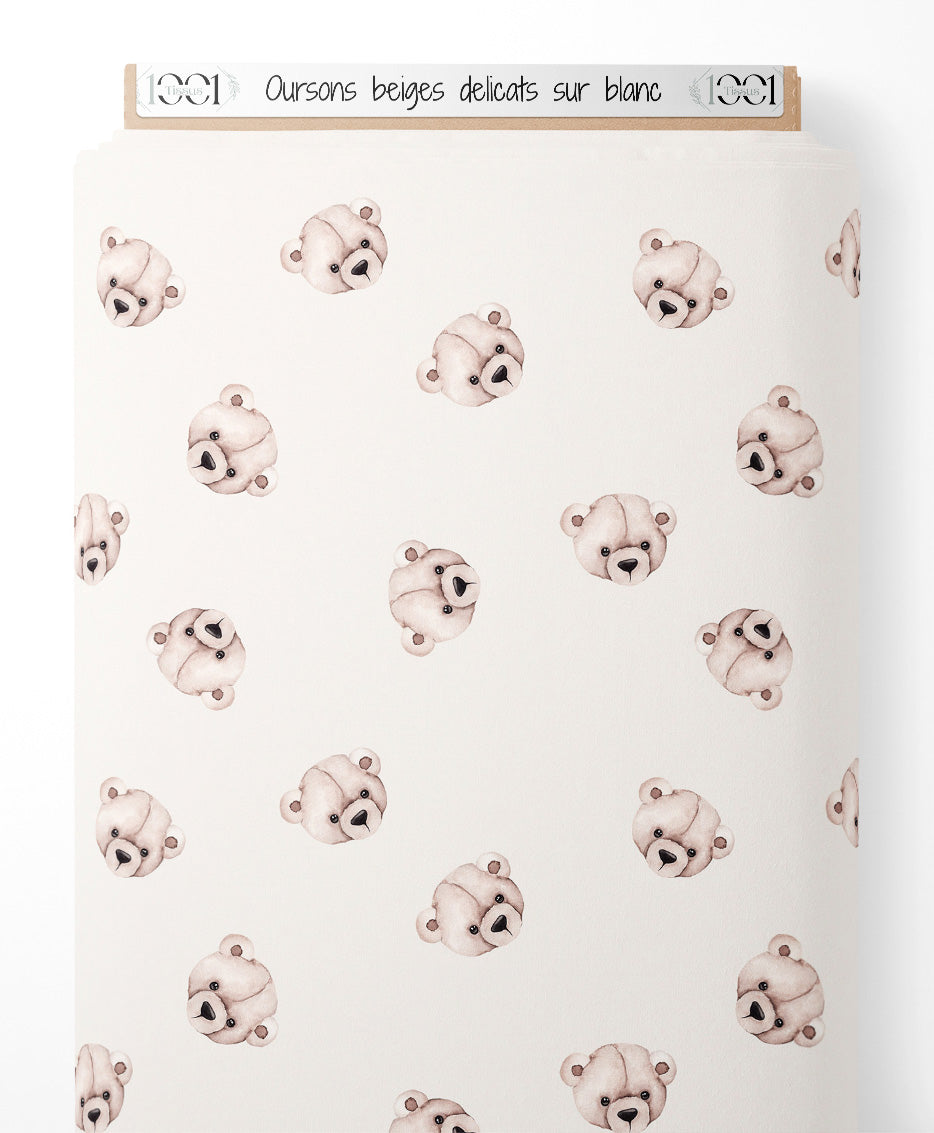 Les oursons sont représentés avec des nuances subtiles de beige et des traits fins. Le fond blanc met en valeur la douceur des motifs. Chaque tête d'ourson présente une expression unique, ajoutant une touche charmante au motif.Les tissus