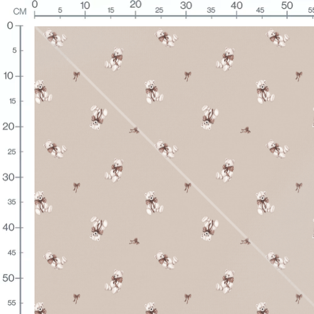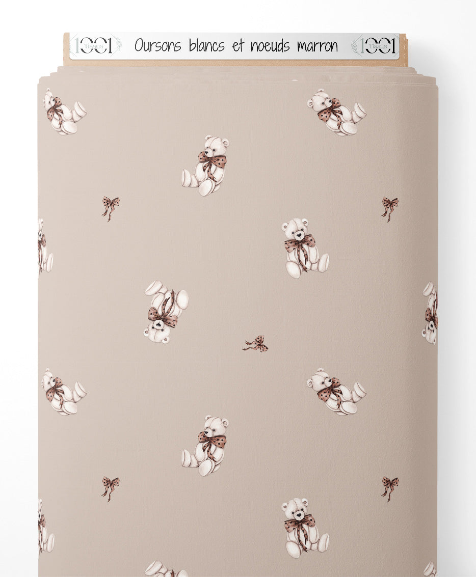 Les oursons sont dessinés avec des détails fins et portent des nœuds papillons marron. Le fond beige met en valeur les motifs d'oursons et de nœuds. Les nœuds marron ajoutent une touche de contraste au motif.Les tissus