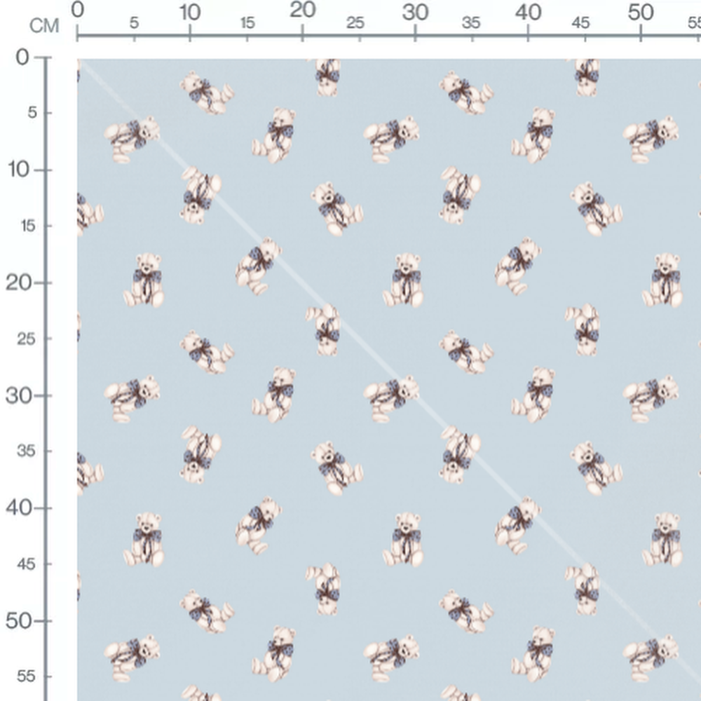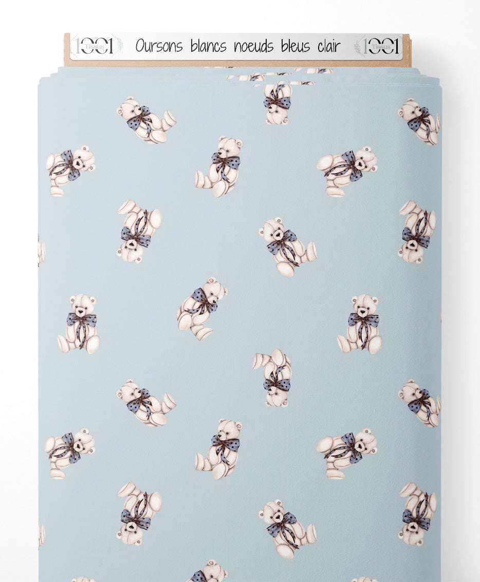 Les oursons sont dessinés avec des détails délicats et portent des nœuds papillon bleus à pois. Le fond bleu clair met en valeur les oursons et leurs accessoires.Les tissus
