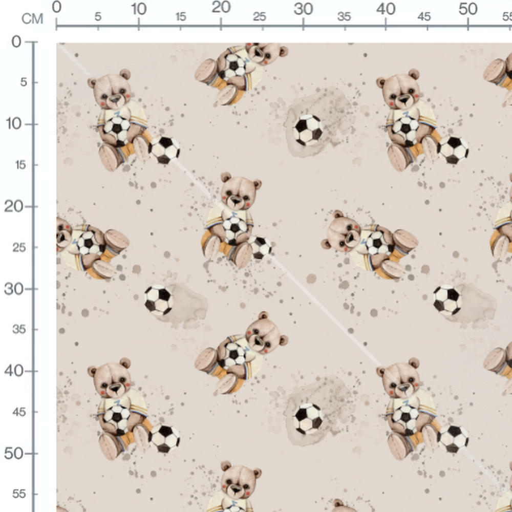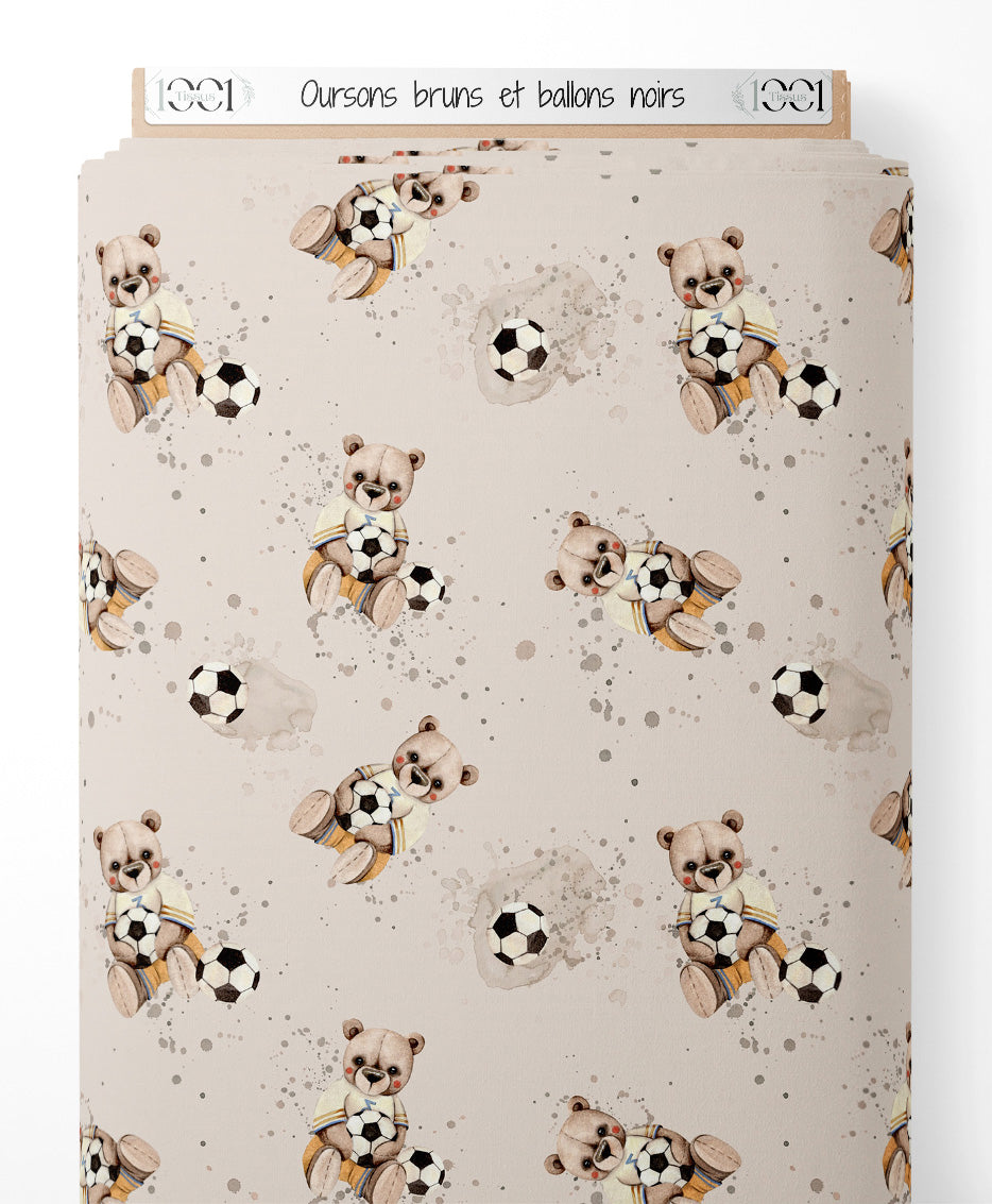 Les oursons portent des vêtements rayés et tiennent des ballons de football. Le fond beige est parsemé de taches aquarelles grises et brunes. Les ballons de football sont noirs et blancs.Les tissus