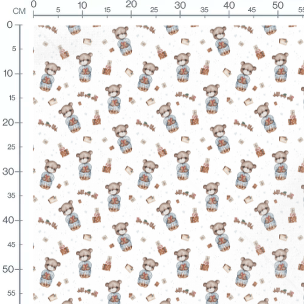Les oursons portent des pyjamas bleus et tiennent des cadeaux rouges. Des lettres et des paquets cadeaux marron sont éparpillés sur le fond blanc. De petites étoiles grises ajoutent des détails subtils au motif.Les tissus