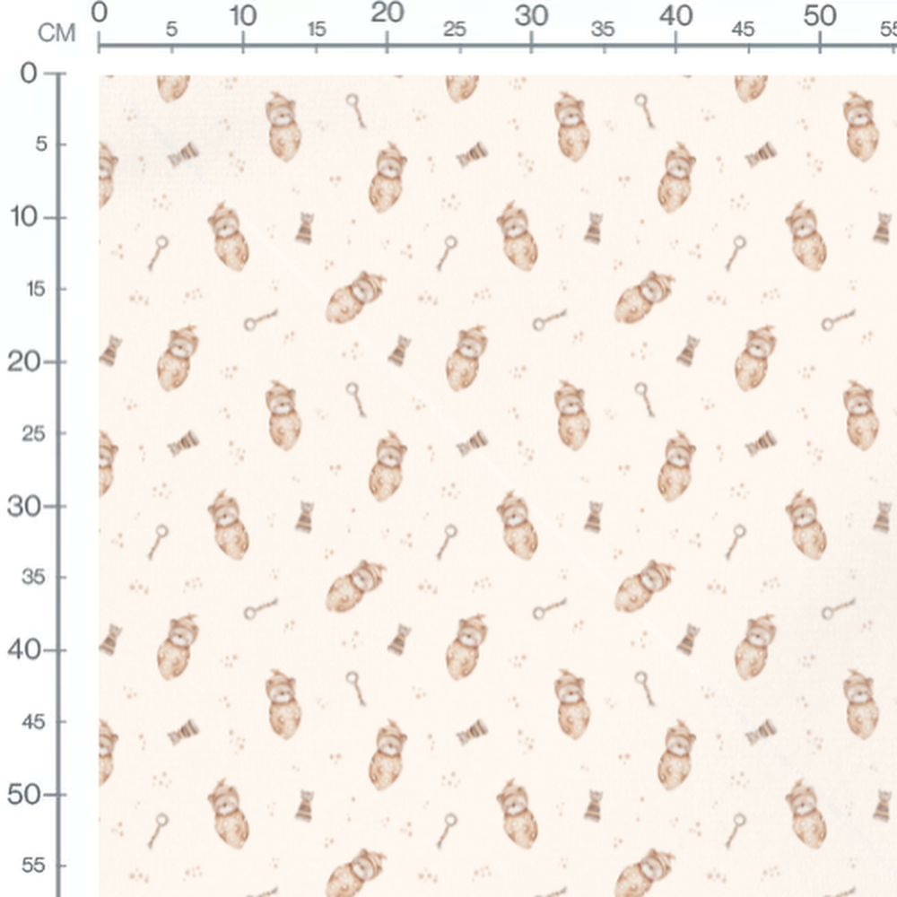 Les oursons sont enveloppés dans des couvertures à pois. Des jouets en forme de clés et de petits animaux complètent le motif.Les tissus