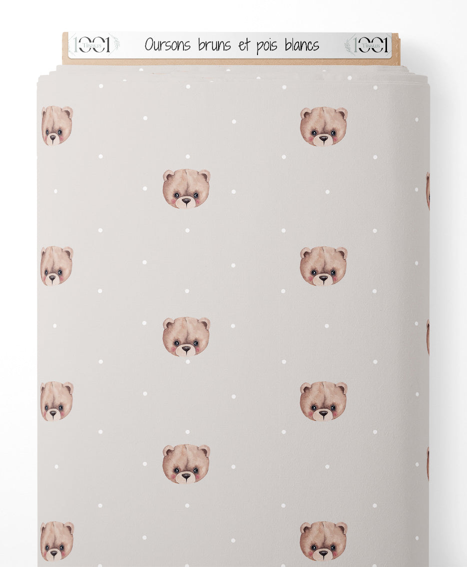 Les oursons ont des expressions douces et des nuances de brun. Les pois blancs ajoutent un élément graphique subtil.Les tissus