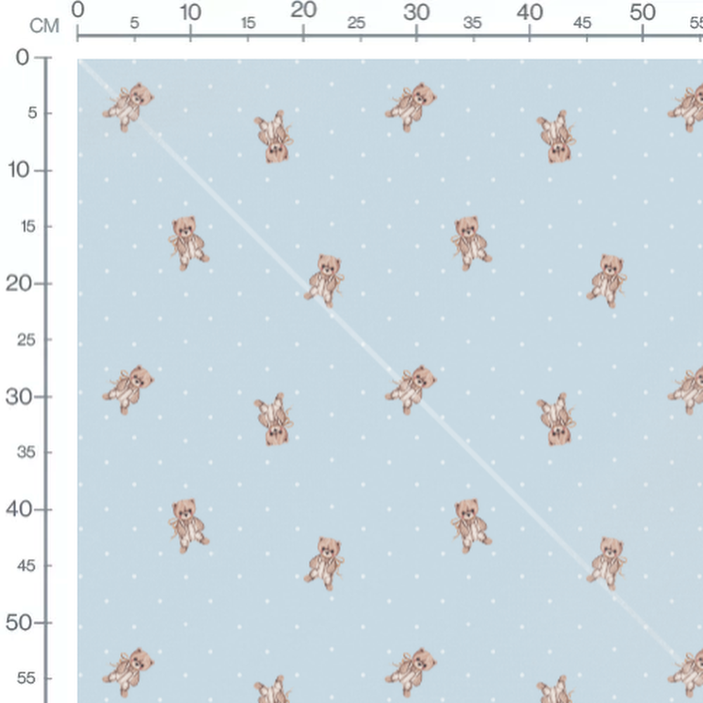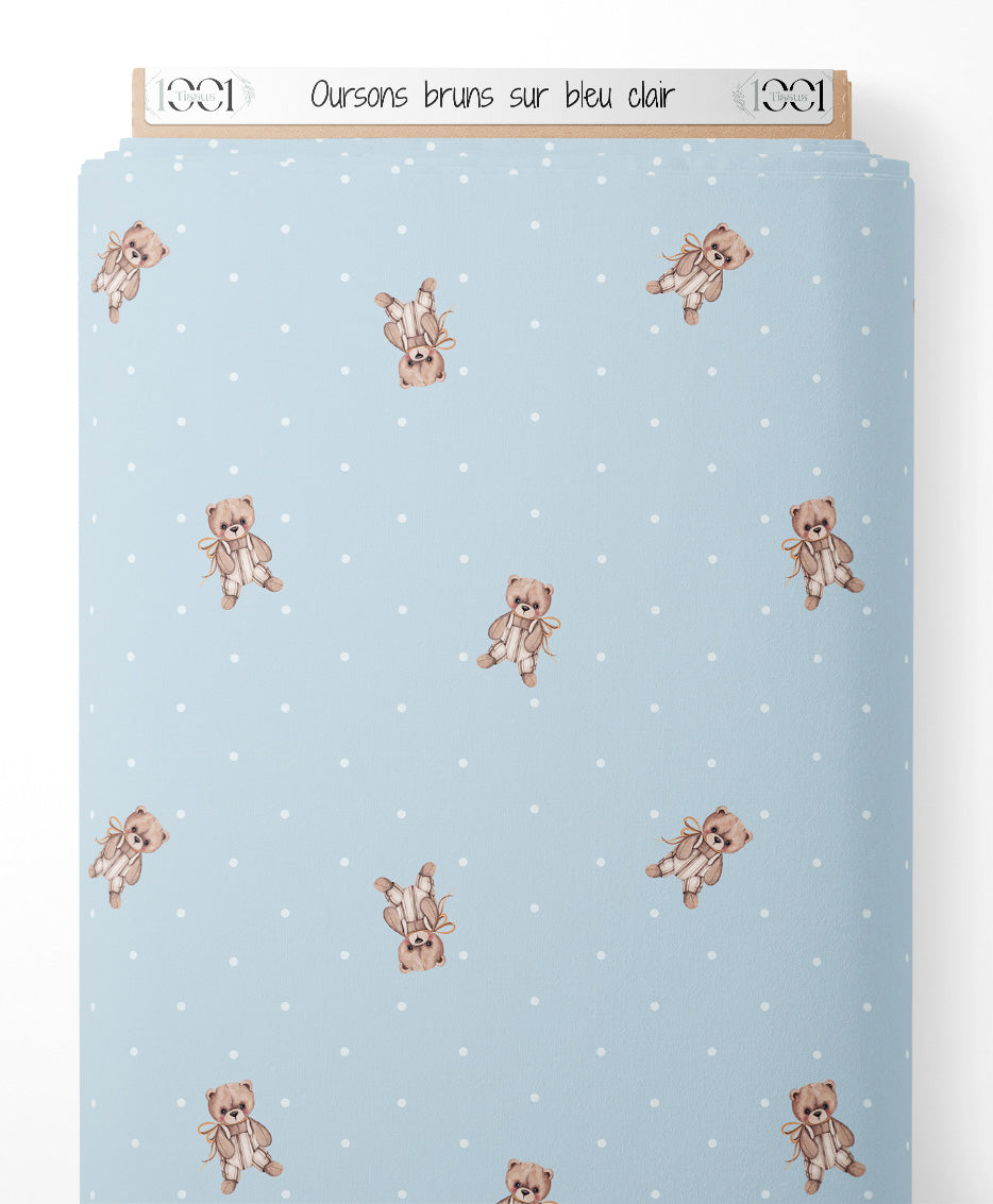 Les oursons portent un pyjama beige avec des nœuds. Le fond bleu clair est parsemé de pois blancs réguliers.Les tissus