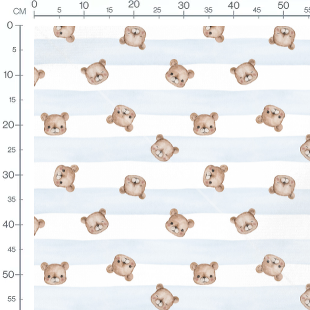 Les rayures sont d'un bleu doux et alternent avec le blanc. Les oursons présentent des expressions faciales différentes, ajoutant une touche ludique au motif.Les tissus