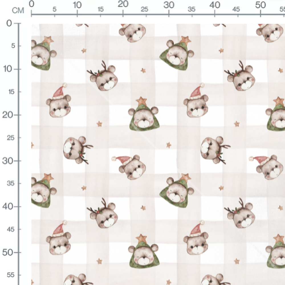 Certains oursons portent des chapeaux de Père Noël rouges et d'autres des chapeaux verts avec des étoiles. Les oursons ont des expressions douces et sont entourés de petites étoiles marron.Les tissus
