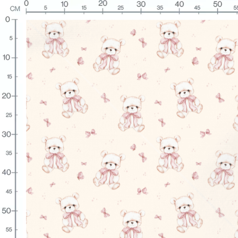 Les oursons portent de grands nœuds roses. De petits papillons roses sont dispersés entre les oursons.Les tissus