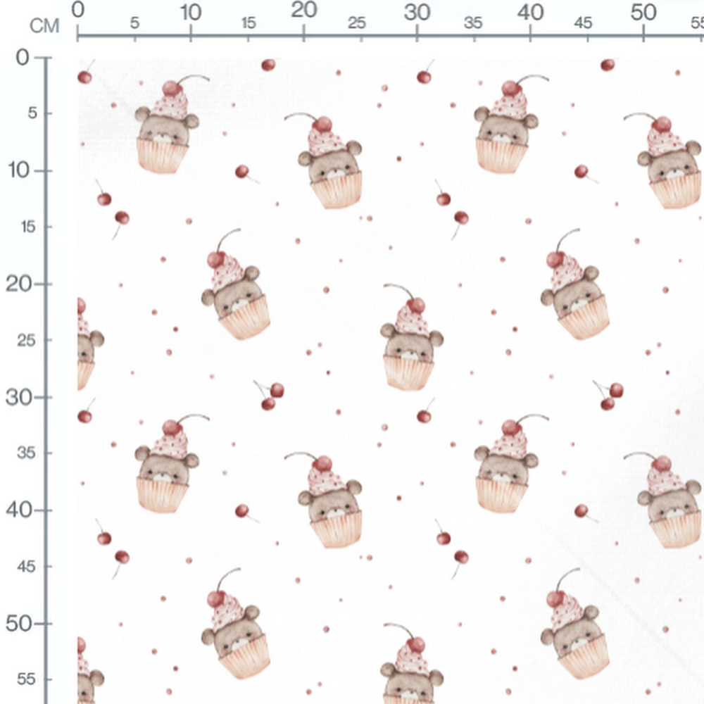 Les oursons sont coiffés de crème rose avec une cerise sur le dessus. Les cerises rouges sont entourées de petits points rouges.Les tissus