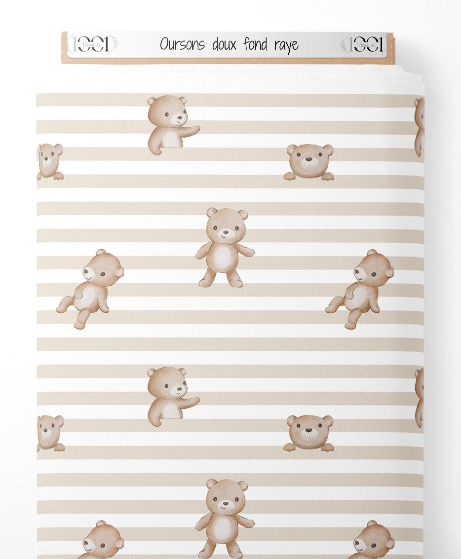 Les oursons ont des expressions douces et sont répartis sur le fond rayé. Les rayures alternent entre beige et blanc, ajoutant un contraste subtil.Les tissus