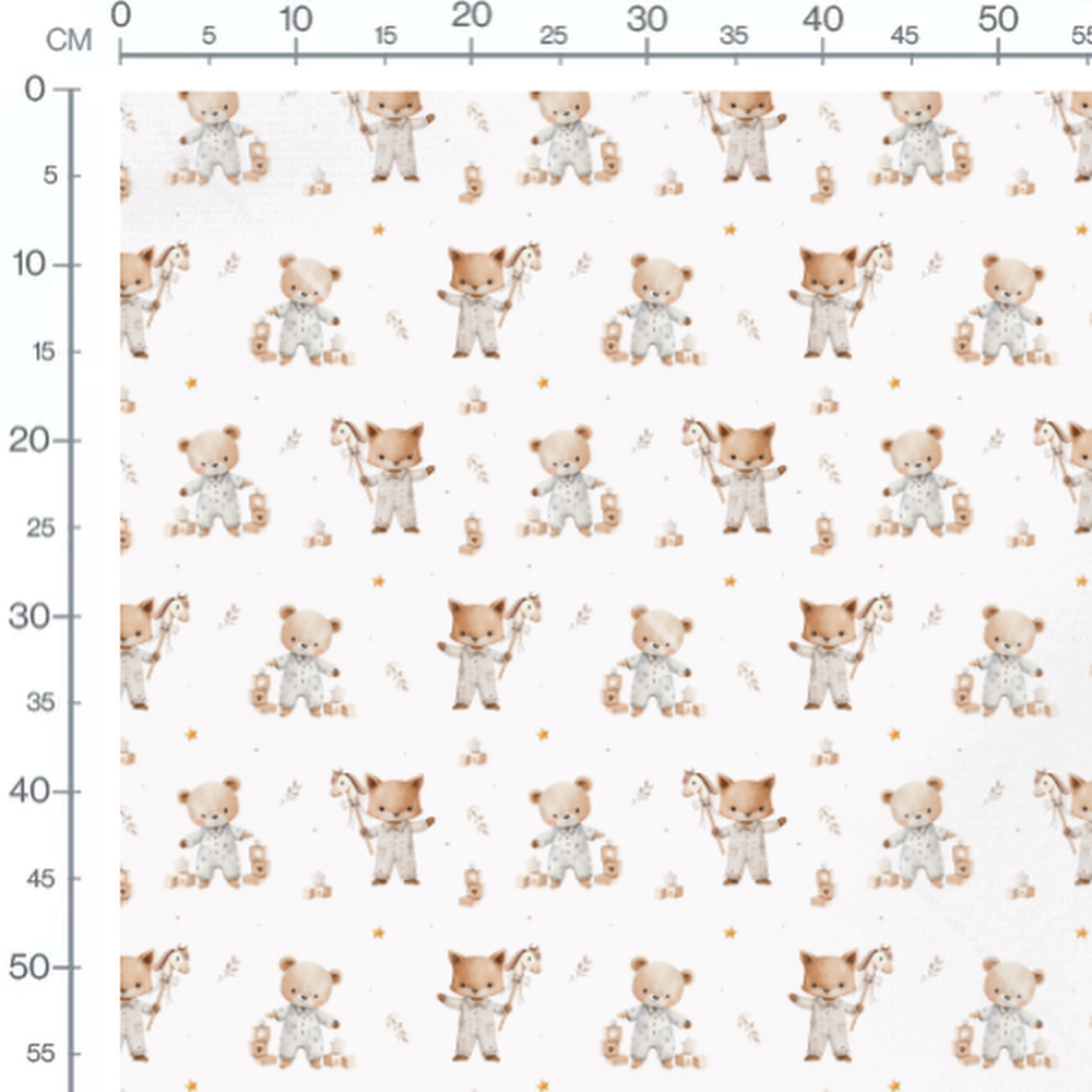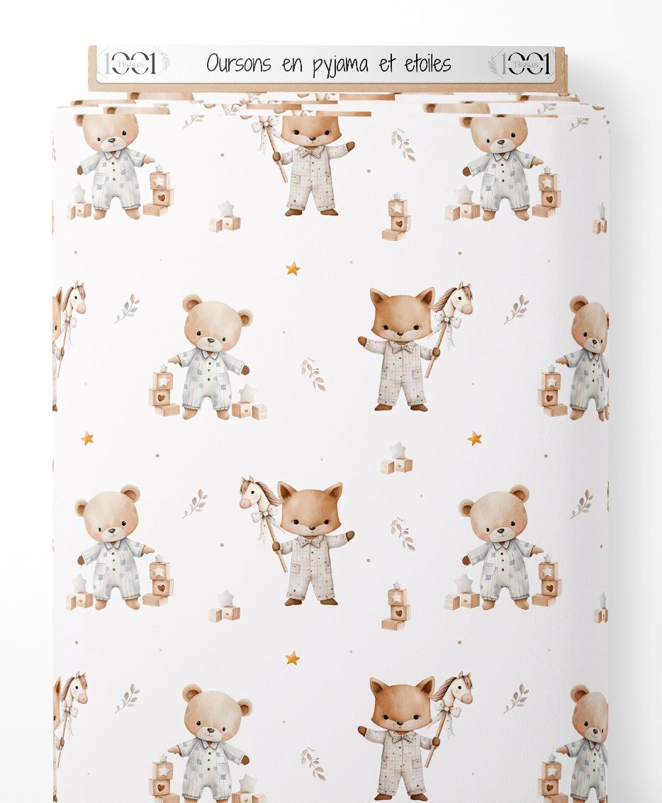 Les oursons portent des pyjamas rayés et tiennent des jouets en bois. Des étoiles jaunes et des feuilles beige ajoutent des détails subtils.Les tissus