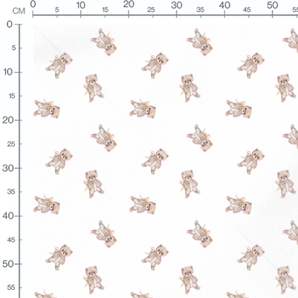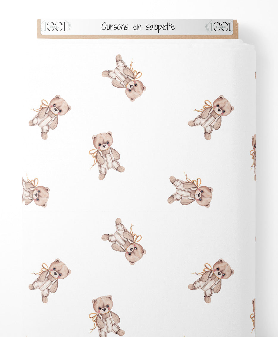 Les oursons portent des salopettes rayées beige et blanche. Chaque ourson a un ruban beige autour du cou.Les tissus