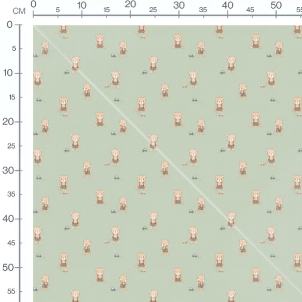 Les oursons portent des salopettes brunes. Les voitures sont reliées par des lignes pointillées.Les tissus
