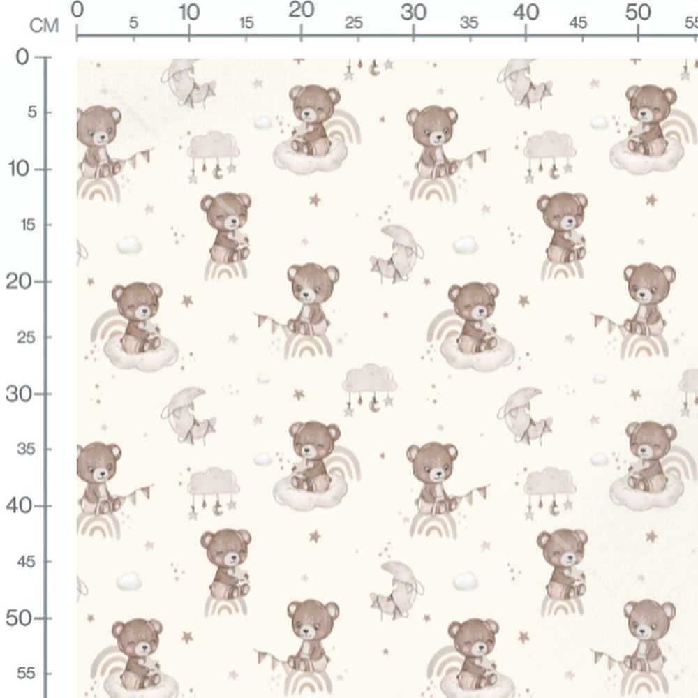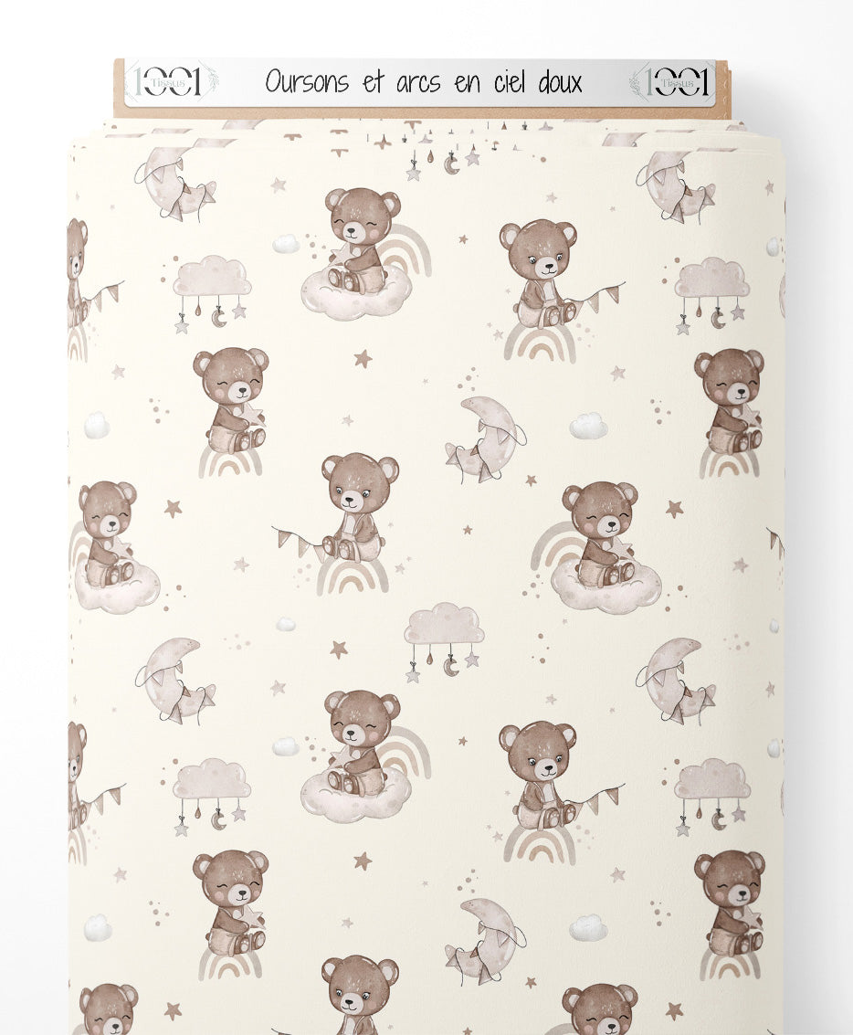 Les oursons tiennent des guirlandes et sont entourés de petits nuages. Des étoiles et des arcs-en-ciel complètent le motif doux et apaisant.Les tissus
