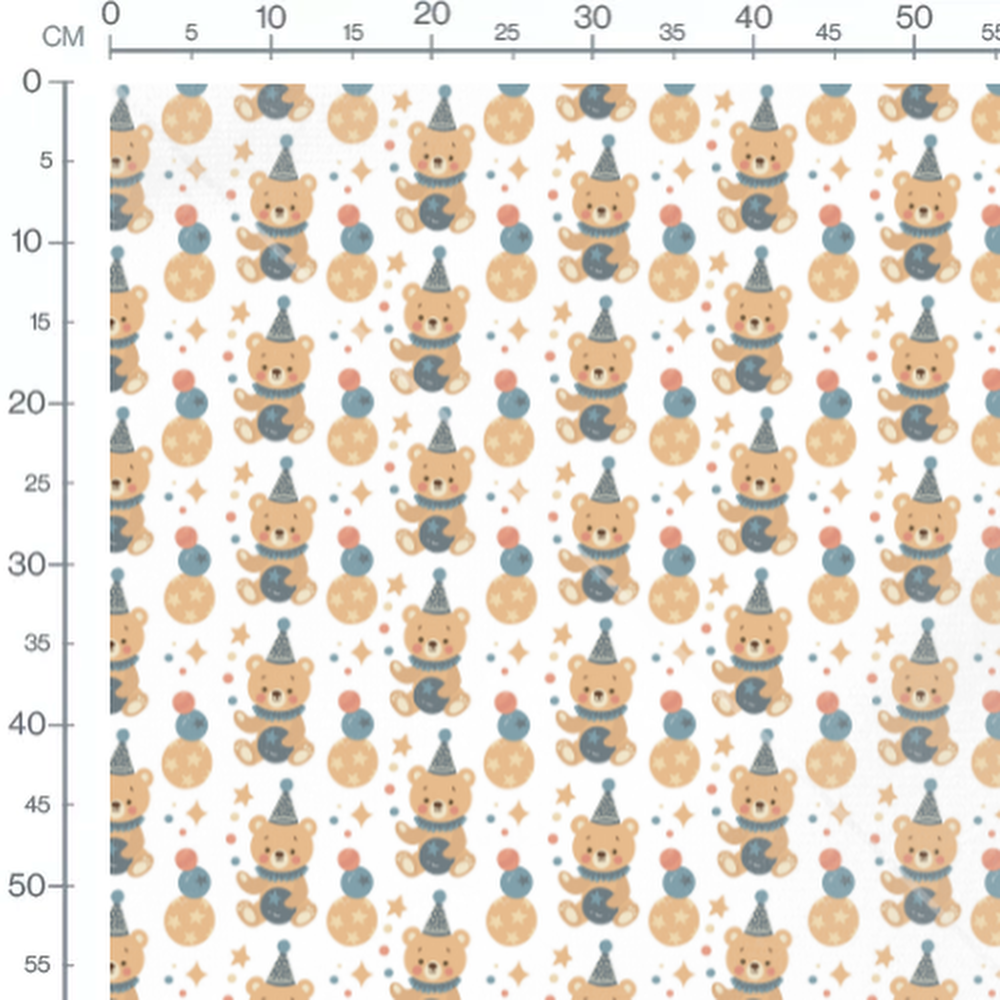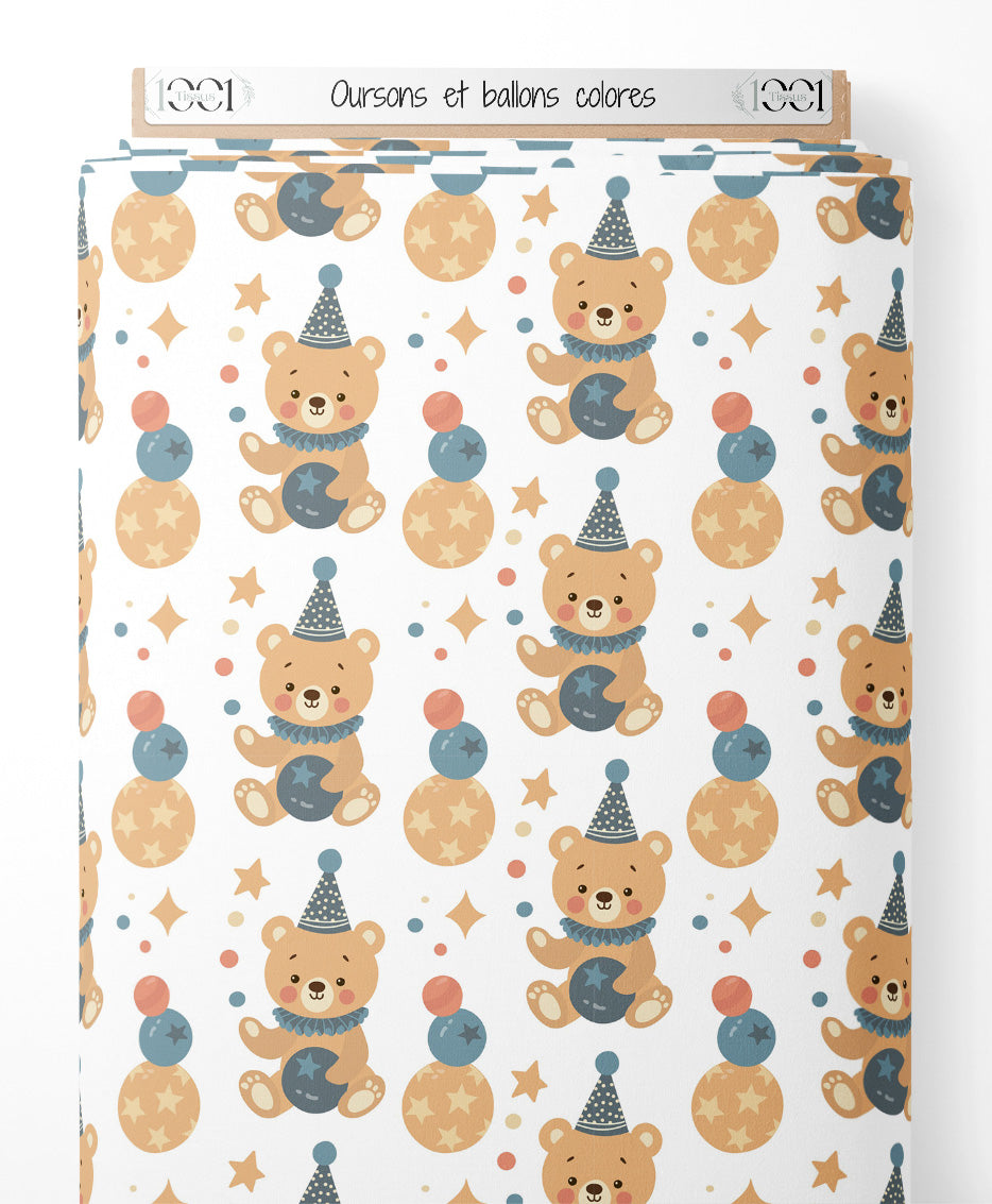 Les oursons portent des chapeaux à pois et des collerettes bleues. Les ballons sont décorés d'étoiles et de cercles. Des petites étoiles et cercles colorés complètent le motif.Les tissus