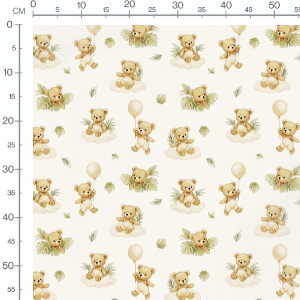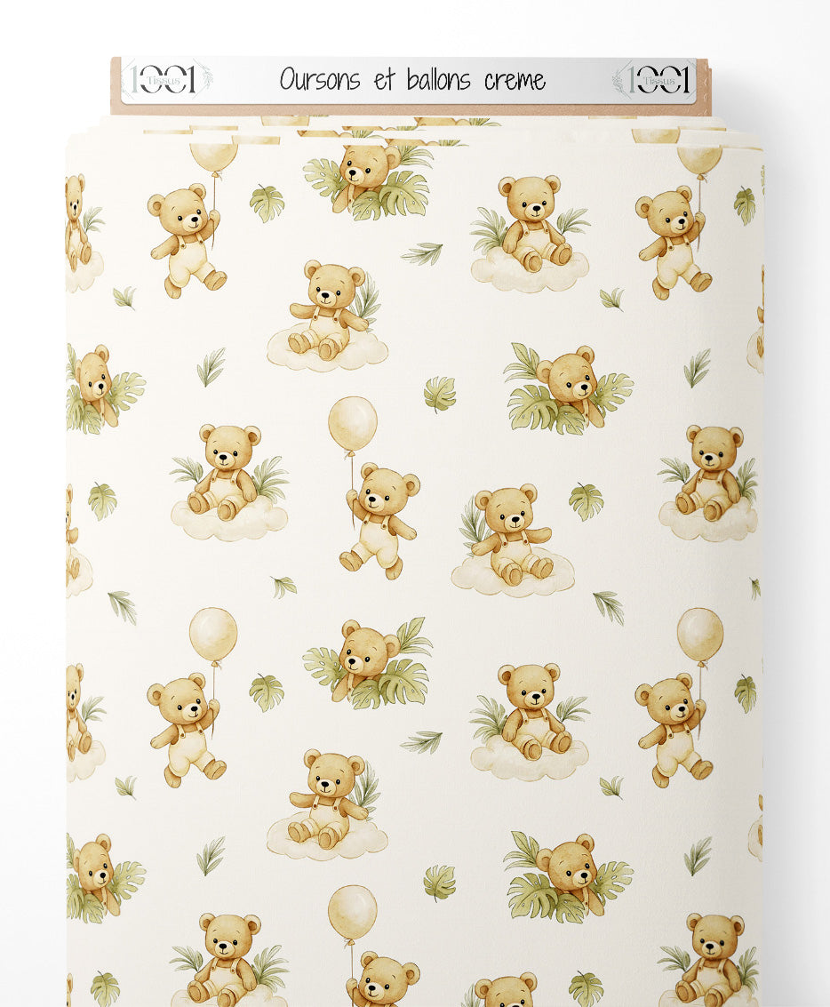 Les oursons tiennent des ballons beige clair. Des feuilles vertes entourent les oursons assis sur des nuages.Les tissus