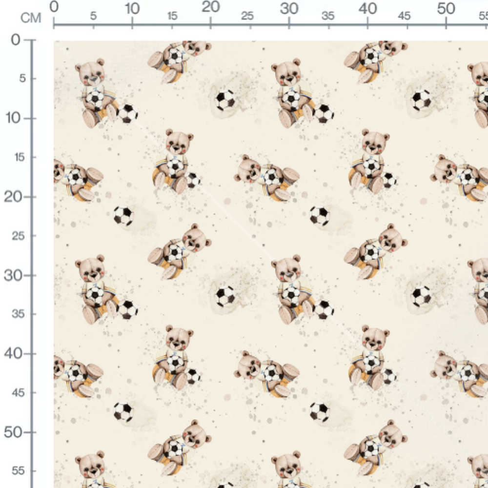 Les oursons portent des vêtements rayés et tiennent des ballons de football. Le fond beige est parsemé de taches aquarelle grises et beiges. Les oursons sont dessinés dans un style doux et enfantin.Les tissus