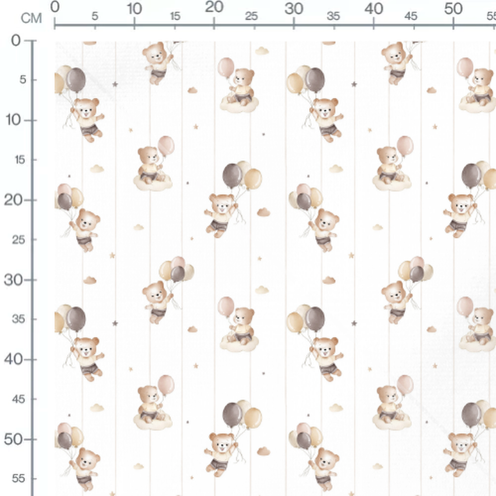 Les oursons tiennent des ballons dans des tons doux de beige et gris. De petits nuages et étoiles complètent le motif. Les ballons ajoutent une touche aérienne et ludique.Les tissus