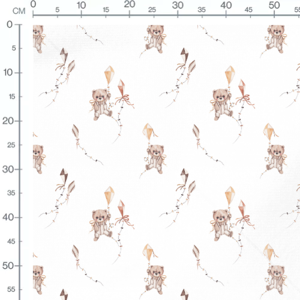 Les oursons tiennent des cerfs-volants aux motifs géométriques. Les rubans des cerfs-volants sont délicatement dessinés. Les couleurs douces créent une ambiance apaisante.Les tissus