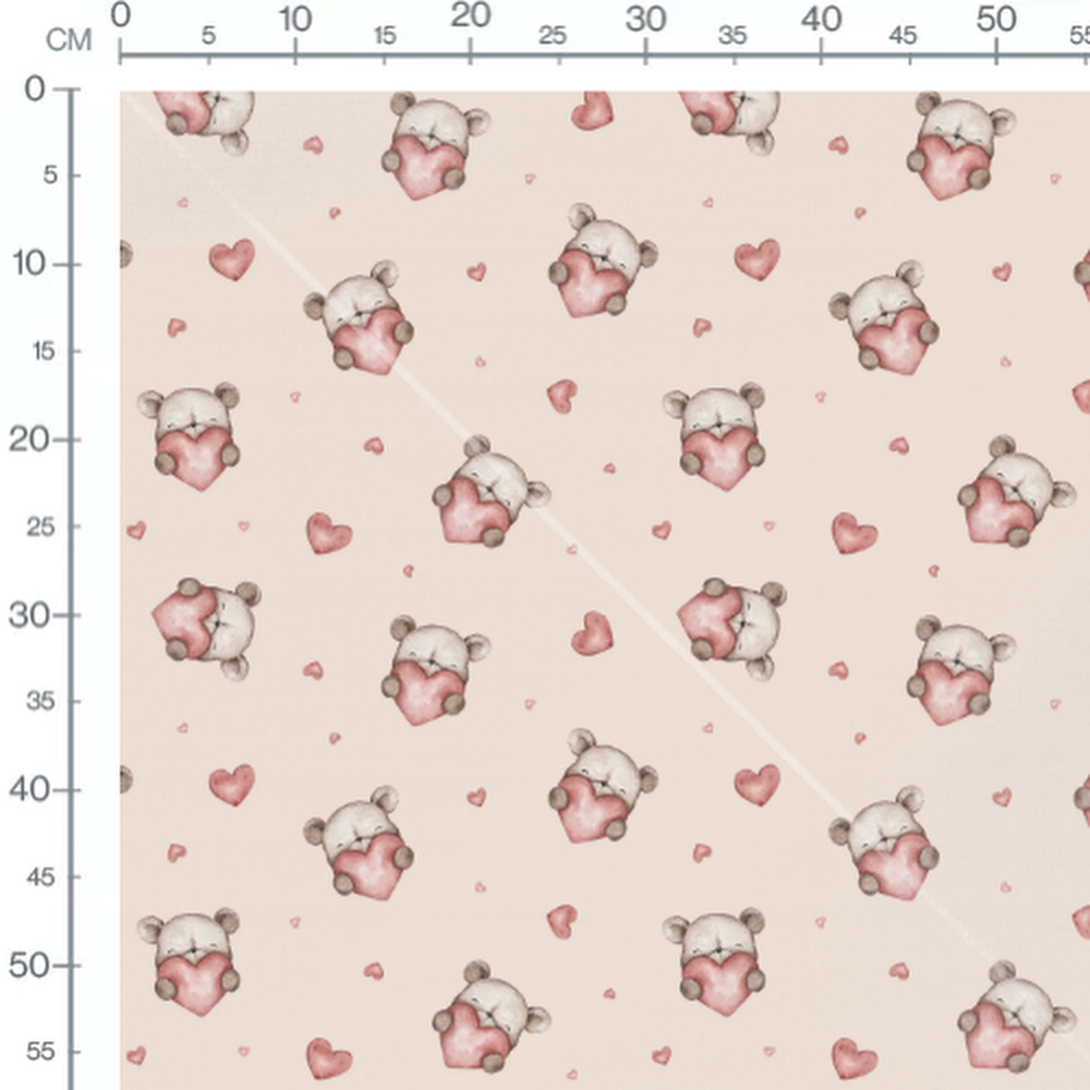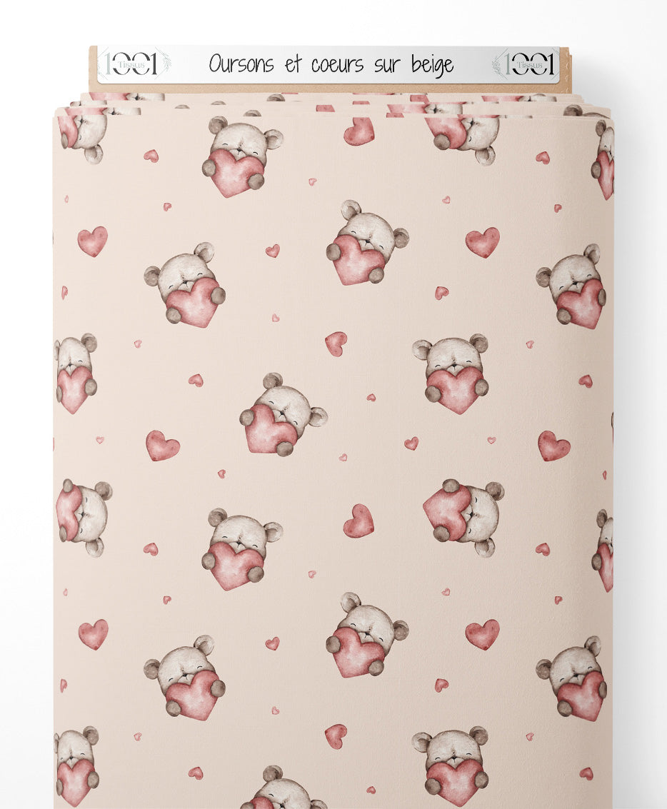 Les oursons sont dessinés dans des tons doux et tiennent des cœurs roses. Le fond beige met en valeur les éléments du motif. Les petits cœurs roses ajoutent une touche de douceur supplémentaire.Les tissus