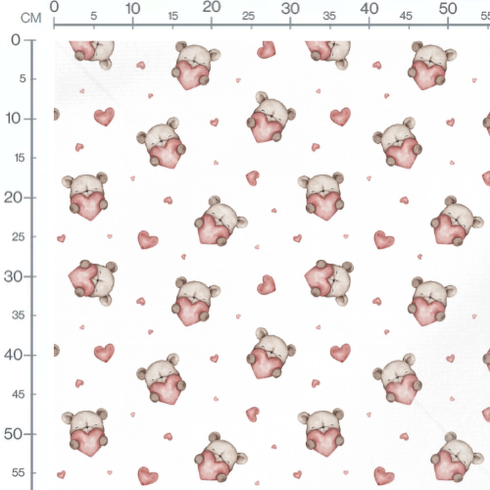 Les oursons sont dessinés dans des tons doux et pastel. Les cœurs roses ajoutent une touche de tendresse au motif. Le fond blanc met en valeur les éléments colorés.Les tissus
