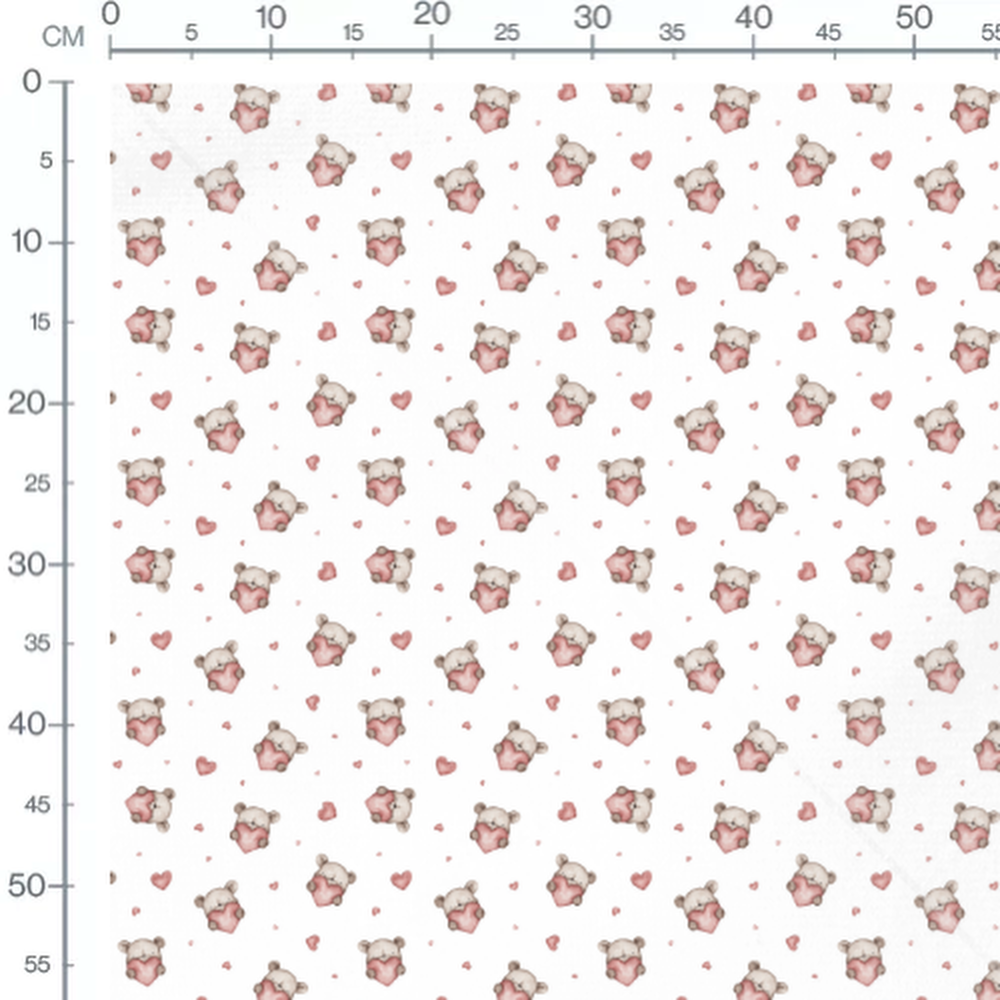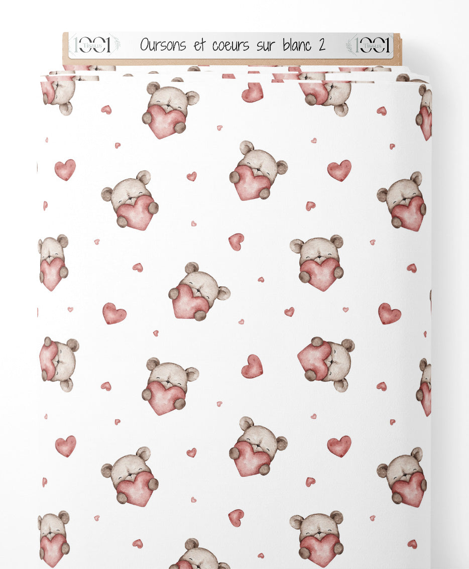 Les oursons sont dessinés dans des tons doux et tiennent chacun un cœur rose. De petits cœurs roses sont éparpillés sur le fond blanc, ajoutant une touche de tendresse au motif.Les tissus