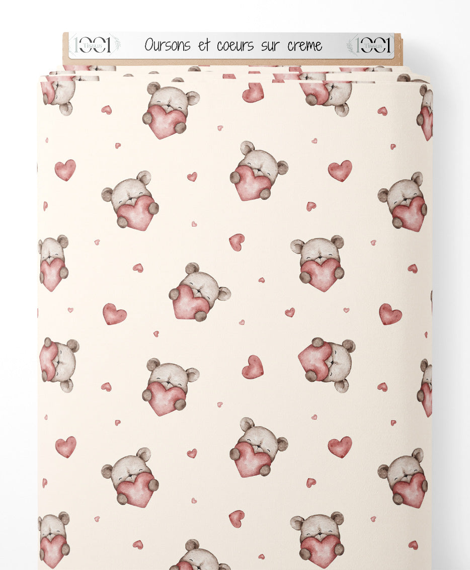Les oursons sont dessinés dans des tons doux et tiennent des cœurs roses. De petits cœurs roses sont éparpillés sur le fond crème, ajoutant une touche de douceur au motif.Les tissus