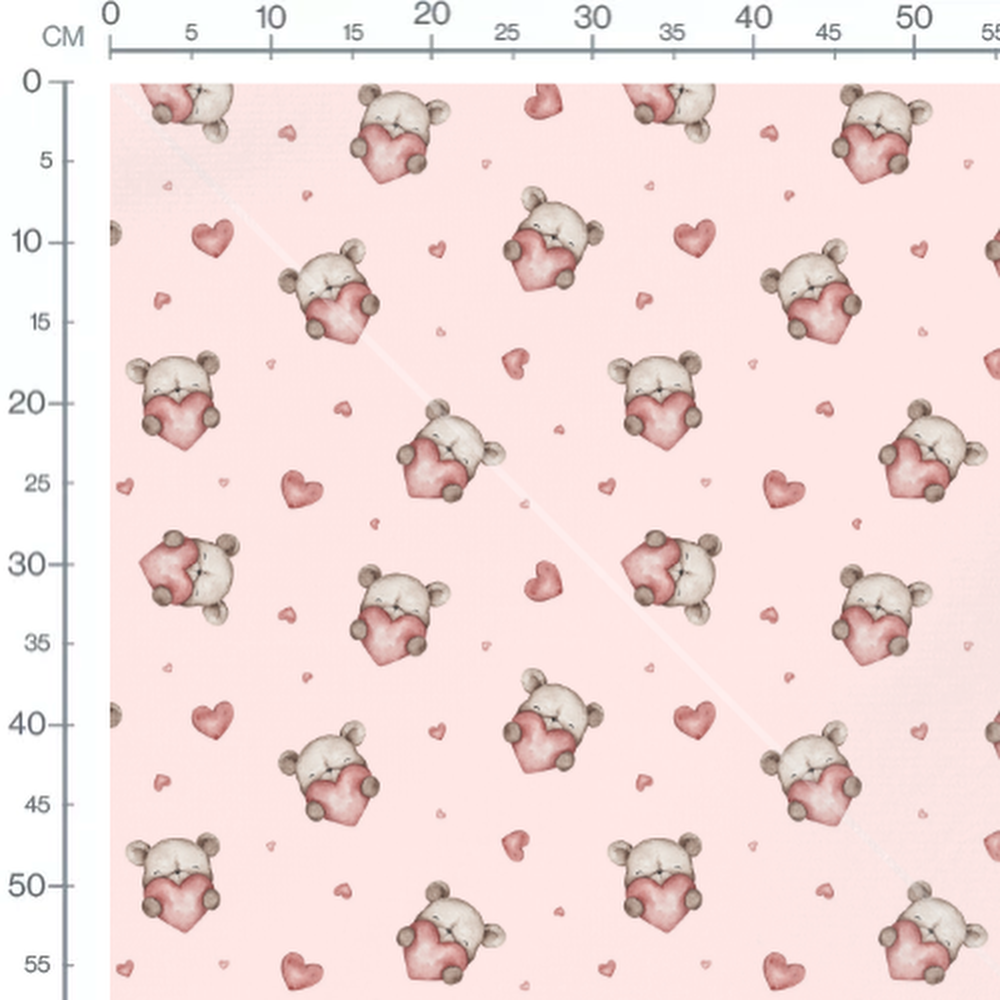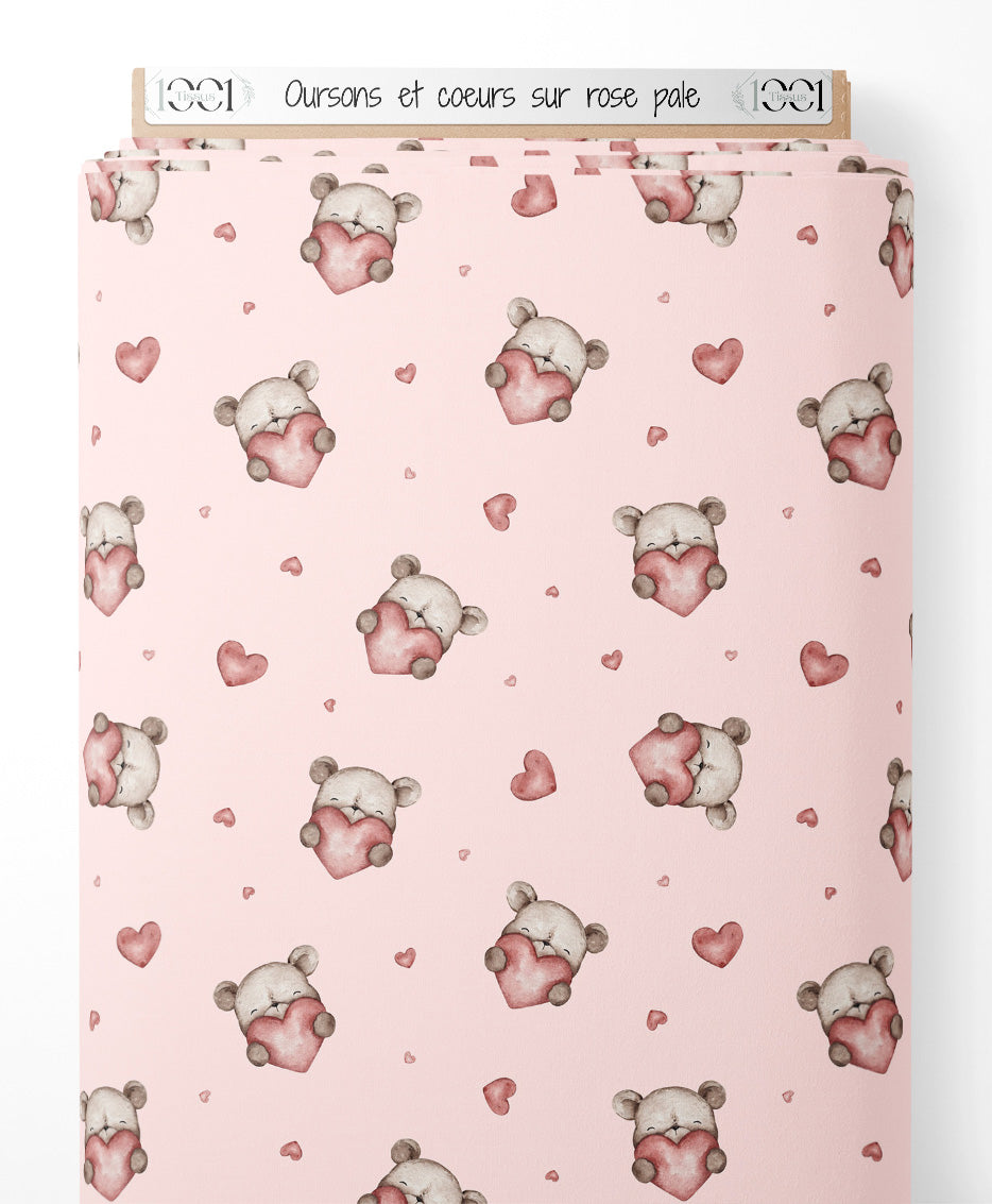 Les oursons sont dessinés dans des tons doux et tiennent des cœurs roses. Le fond rose pâle accentue la douceur du motif. Les petits cœurs ajoutent une touche de charme supplémentaire.Les tissus