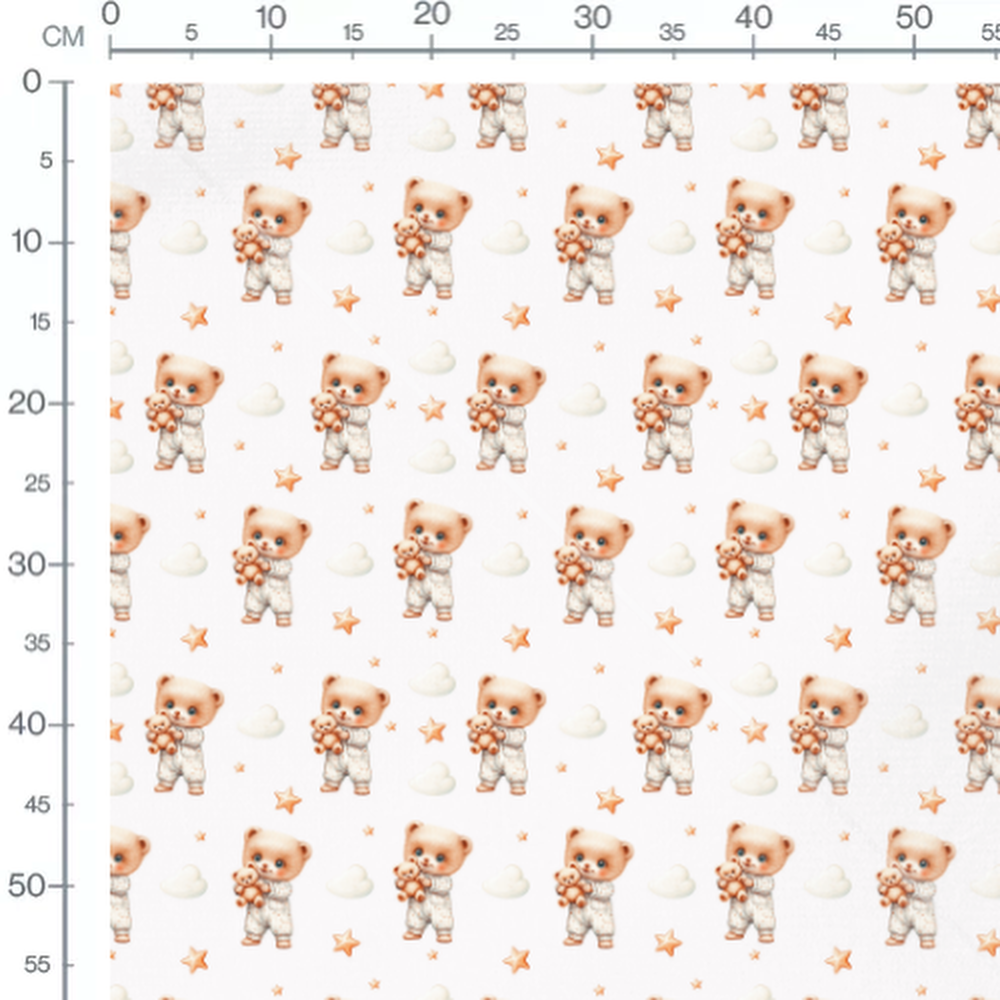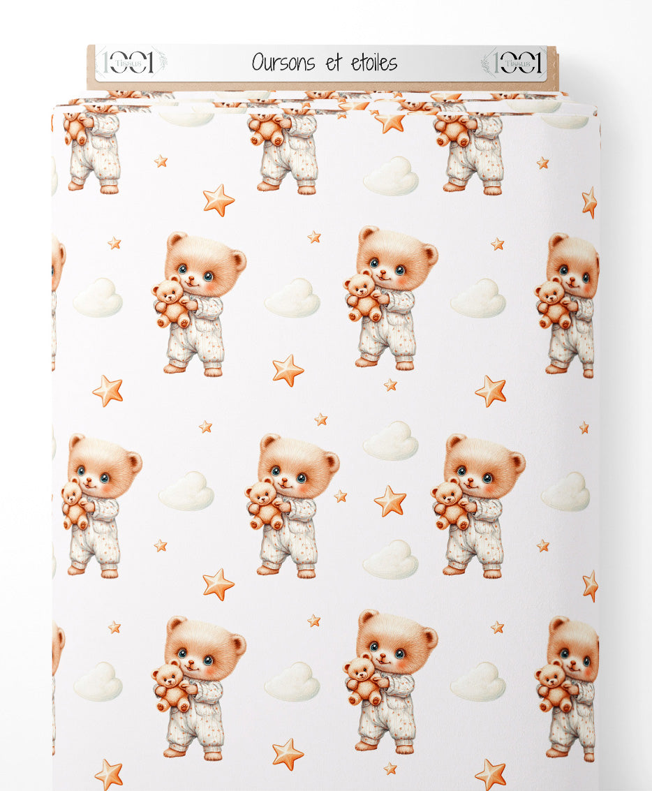 Les oursons portent des pyjamas à motifs et tiennent des petites peluches. Les étoiles orange ajoutent une touche de couleur vive. Les nuages blancs apportent une ambiance douce et rêveuse.Les tissus