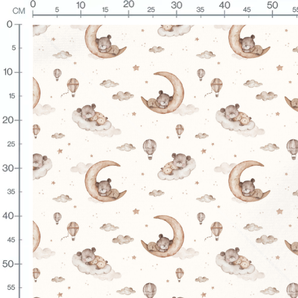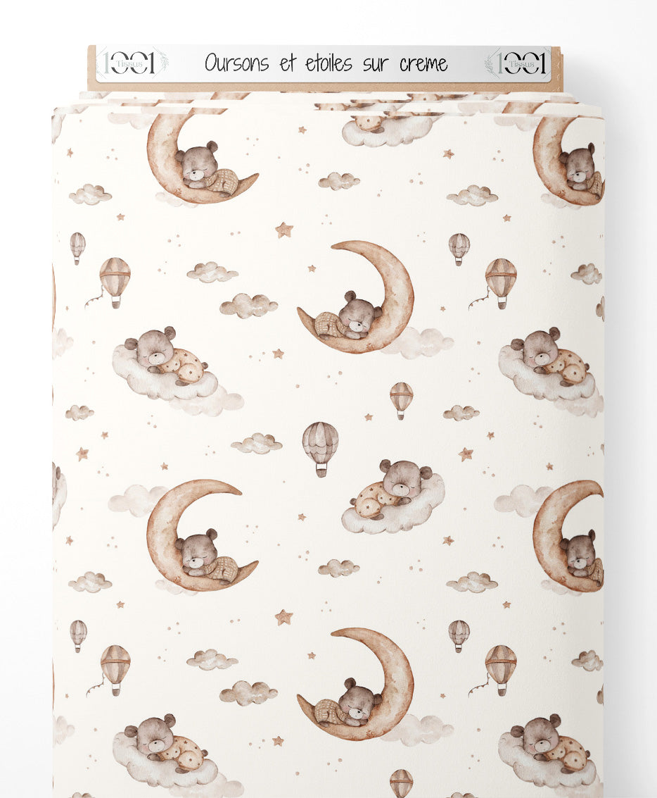Les oursons dorment paisiblement sur des lunes et des nuages. De petites montgolfières flottent parmi les étoiles et les nuages. Le fond crème ajoute une douceur à l'ensemble du motif.Les tissus