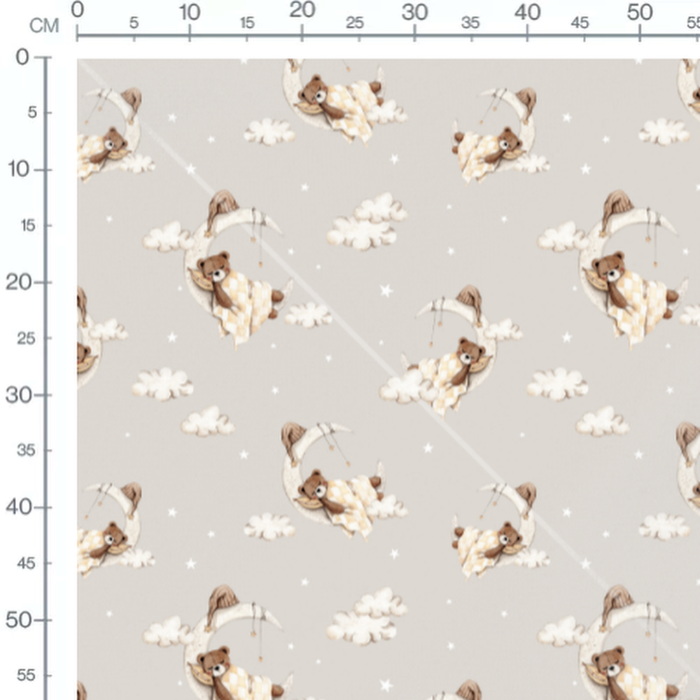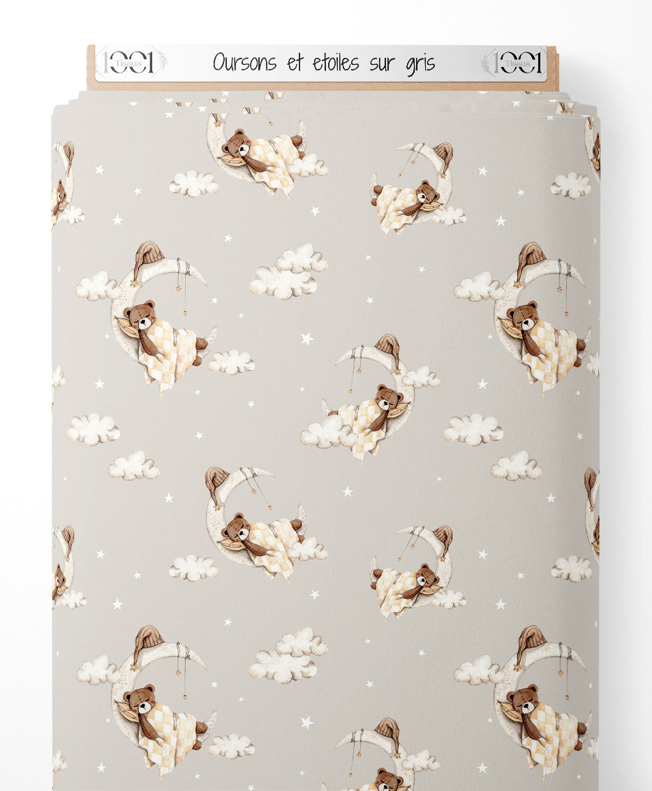 Les oursons sont enveloppés dans des couvertures à motifs géométriques. Les lunes sont ornées de petits pompons suspendus. Les nuages sont moelleux et cotonneux, ajoutant une touche de douceur.Les tissus