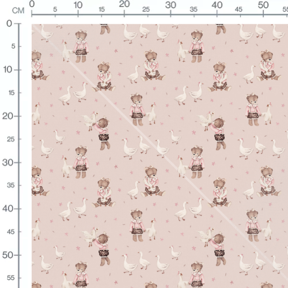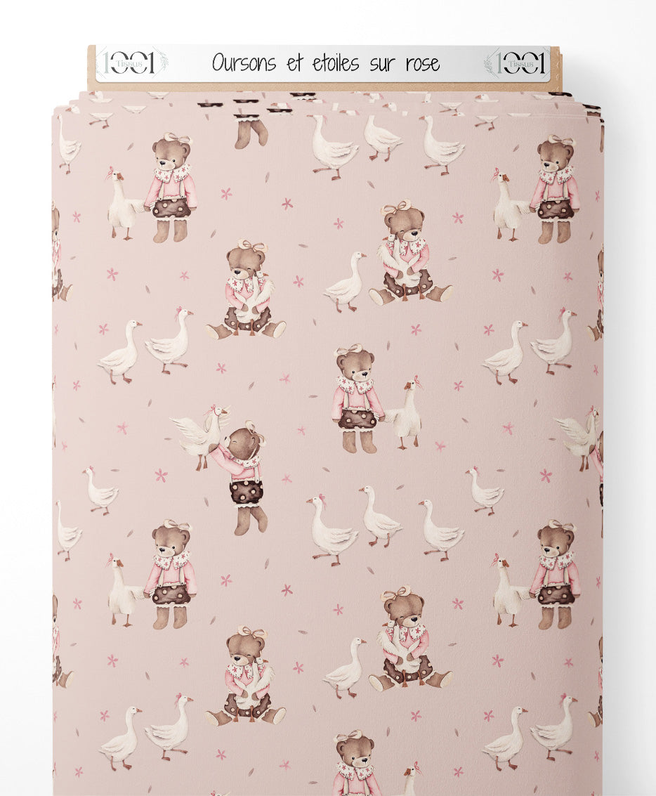 Les oursons portent des vêtements roses et marron. Les oies sont blanches avec des détails roses. De petites étoiles roses ajoutent une touche décorative.Les tissus